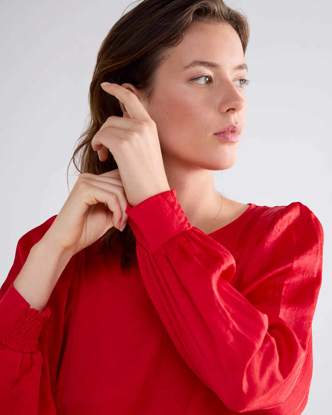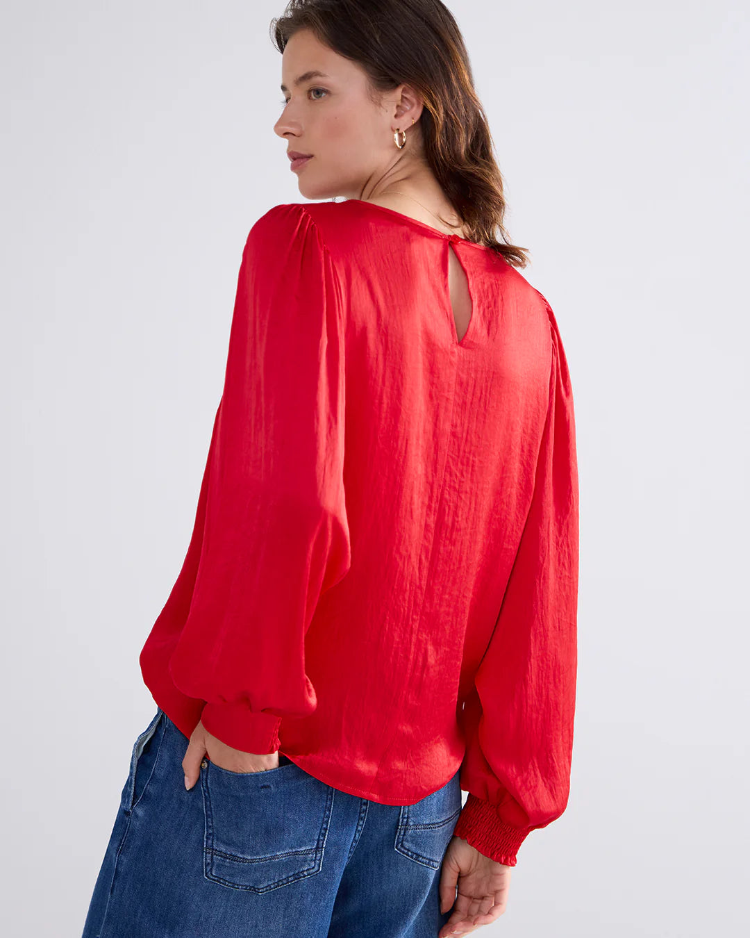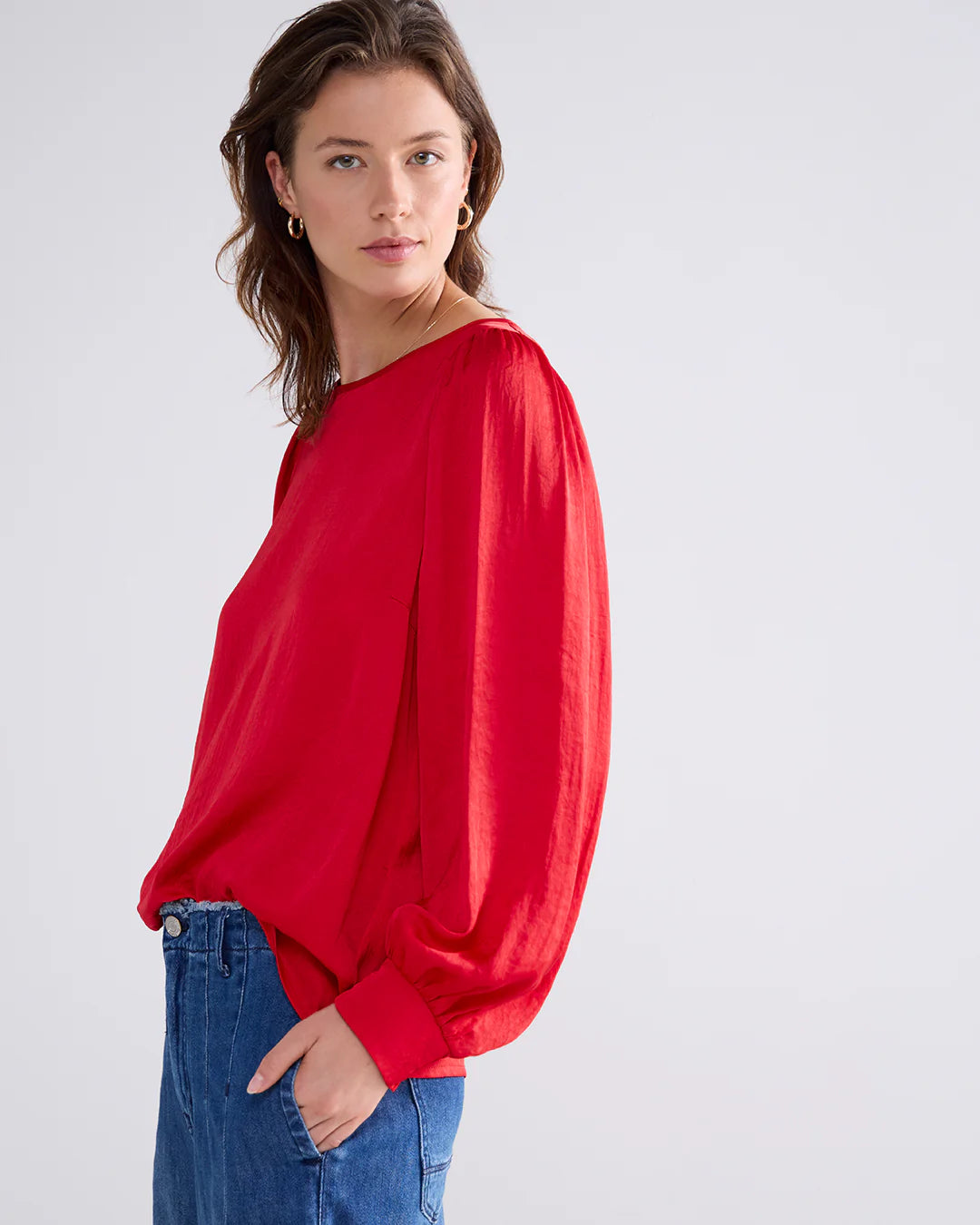 This beautiful feminine top features a wide round neck and long puffed sleeves for movement. The shiny fabric makes this blouse a perfect going out top, just pair with your favourite denim jeans or long pleated skirt for any winter occasion.