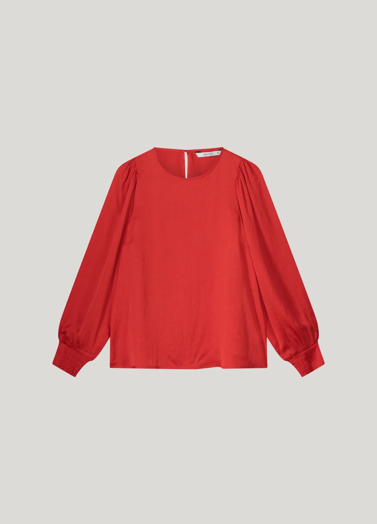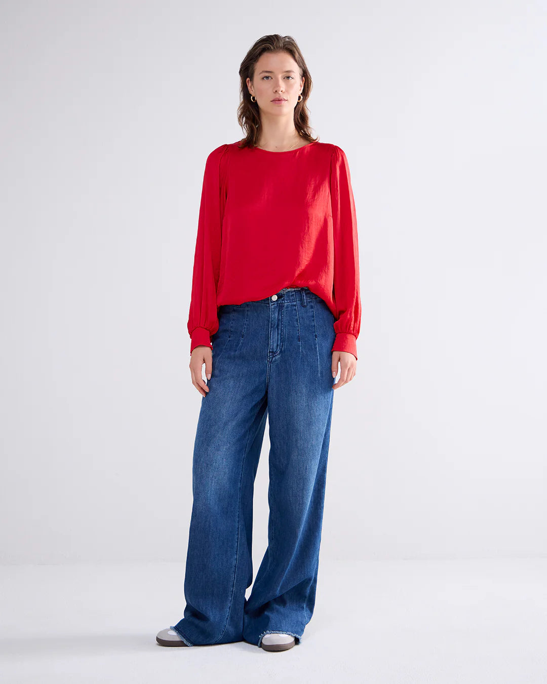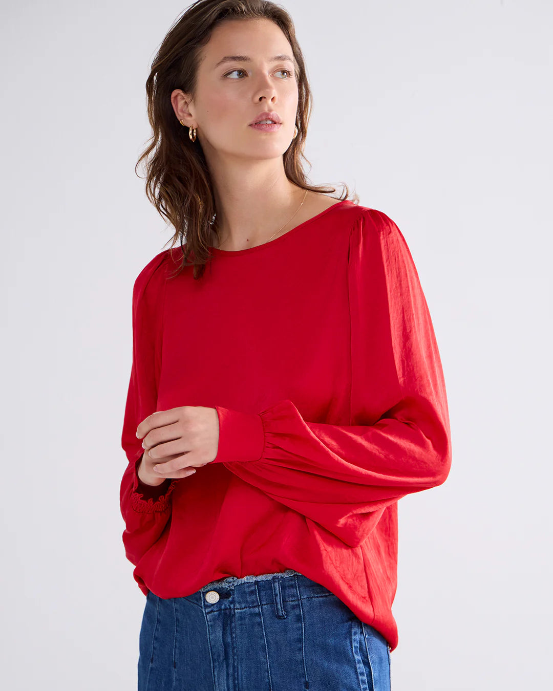 This beautiful feminine top features a wide round neck and long puffed sleeves for movement. The shiny fabric makes this blouse a perfect going out top, just pair with your favourite denim jeans or long pleated skirt for any winter occasion.