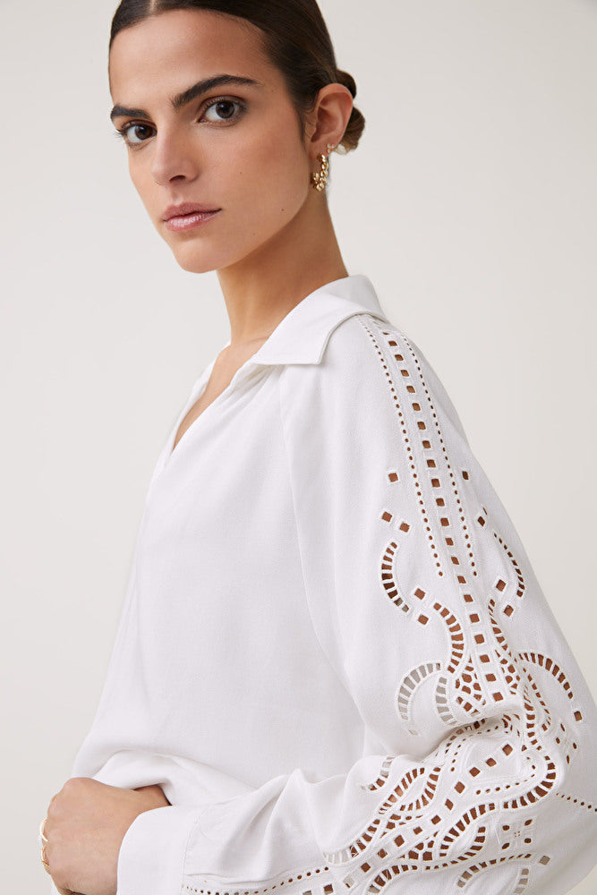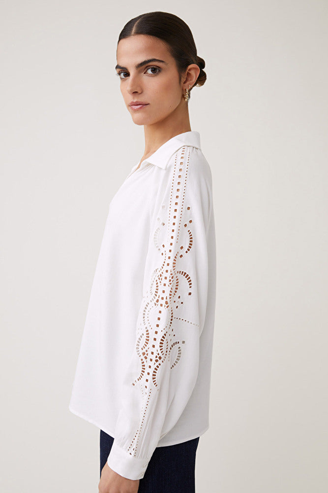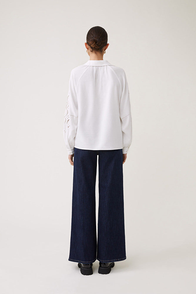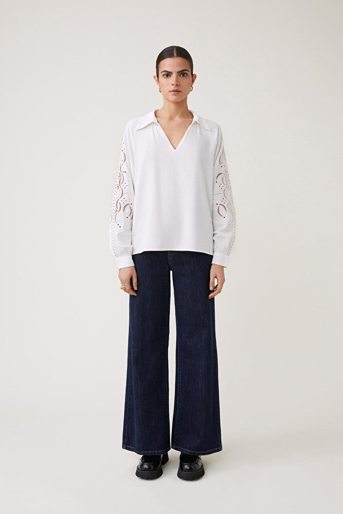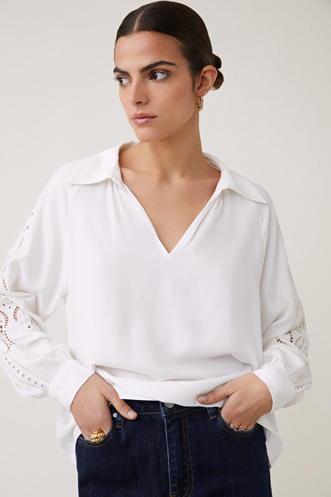 This simple but striking blouse will perfectly integrate into your wardrobe. Its plain long-sleeve design has a classic collar and feminine V-neckline making it easy to wear and style, but the detailed sleeves give this blouse it's unique statement.
