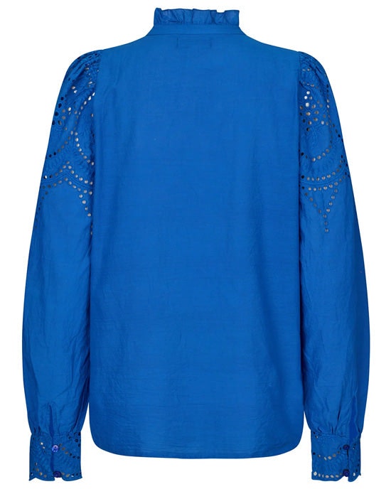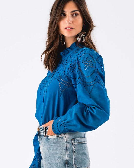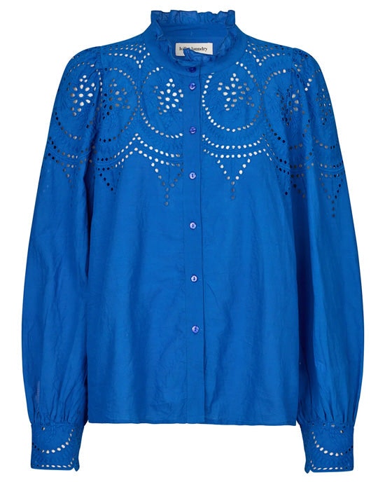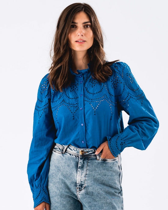 Add a bright bold blue to your daily look with the Lula shirt from Lollys Laundry. In an effortlessly feminine style, with broderie anglaise over the yoke, this blouse will elevate any outfit. Simply pair with denim jeans in an indigo wash or white colour to complete your spring look.