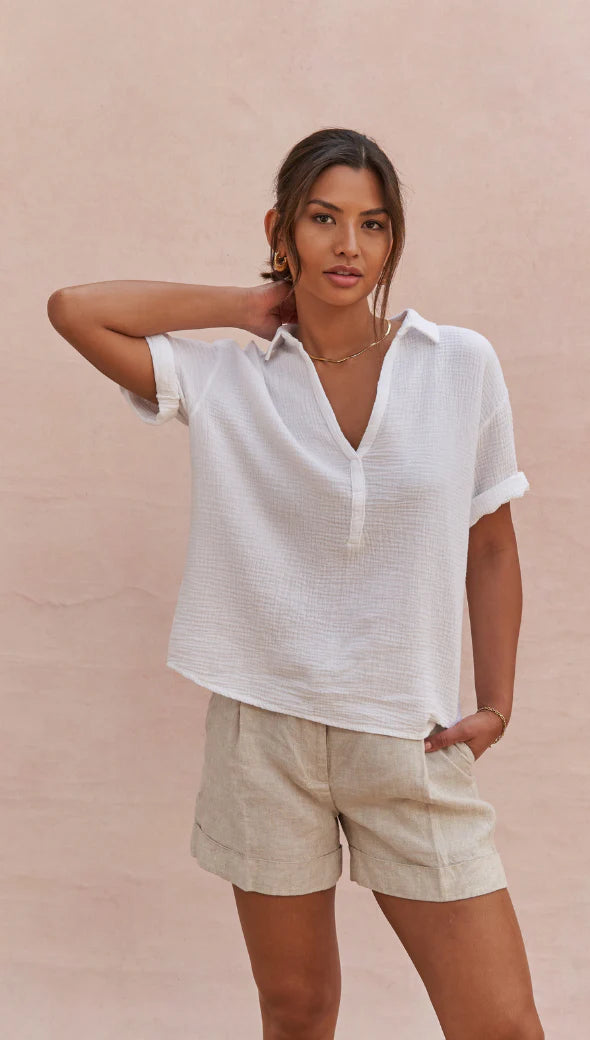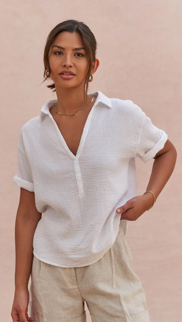 This elevated classic is simple yet chic, and its relaxed fit will keep you comfortable all day. With a stylish popover design, this white shirt is perfect for any occasion. The classic short sleeves and polo collar allow you to pair this style with practically anything!