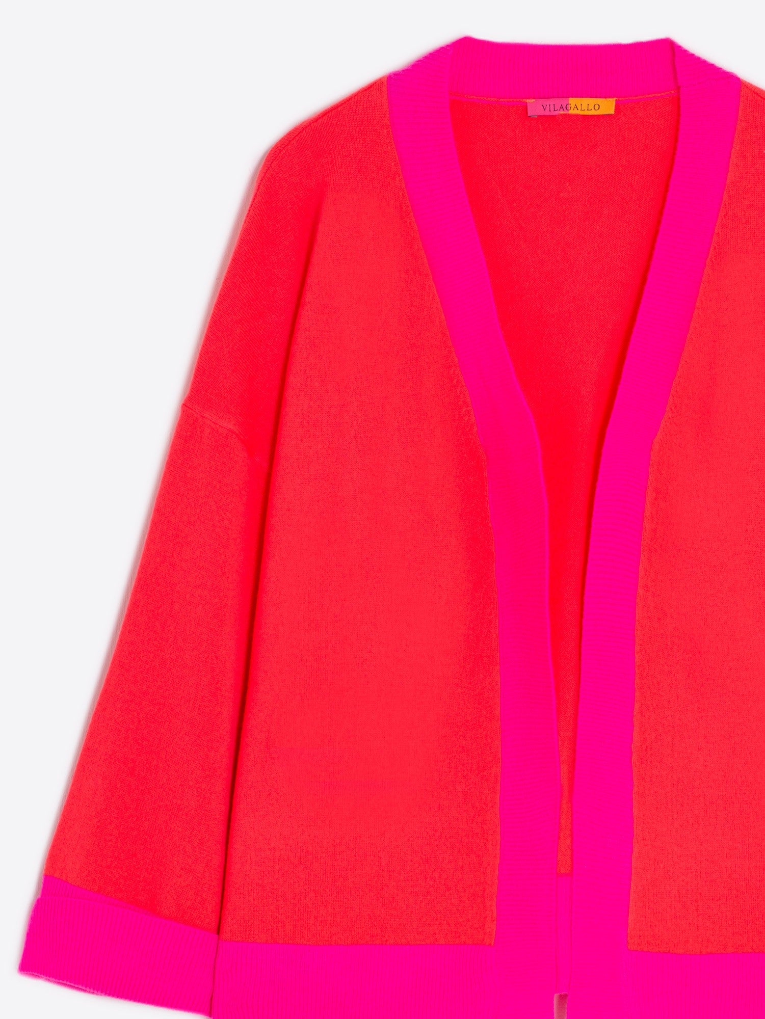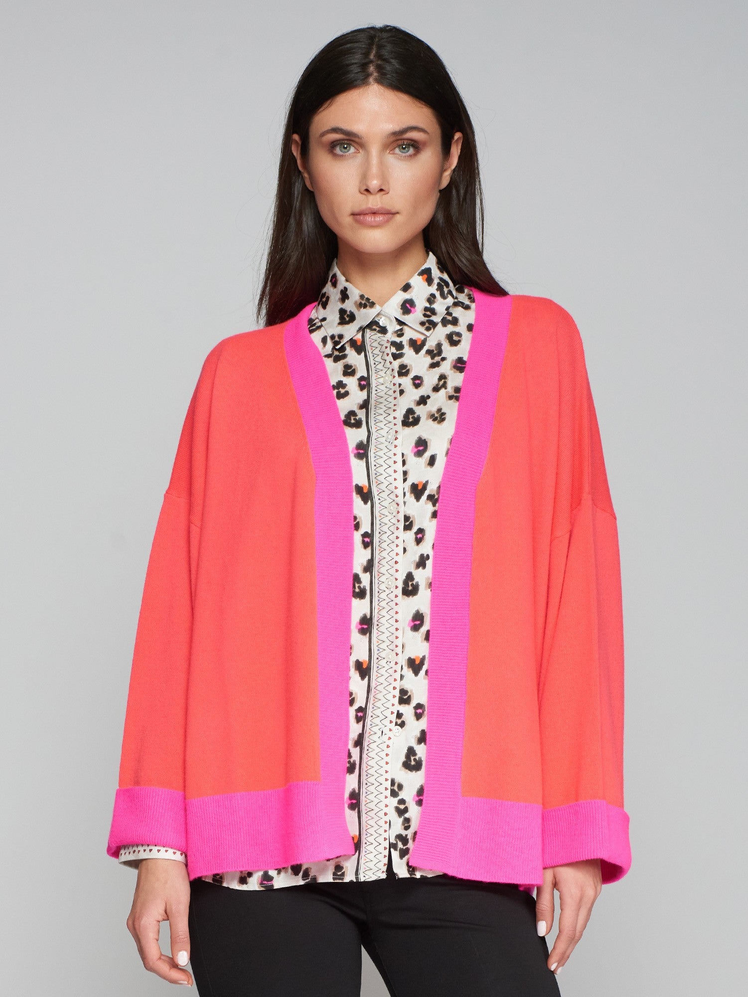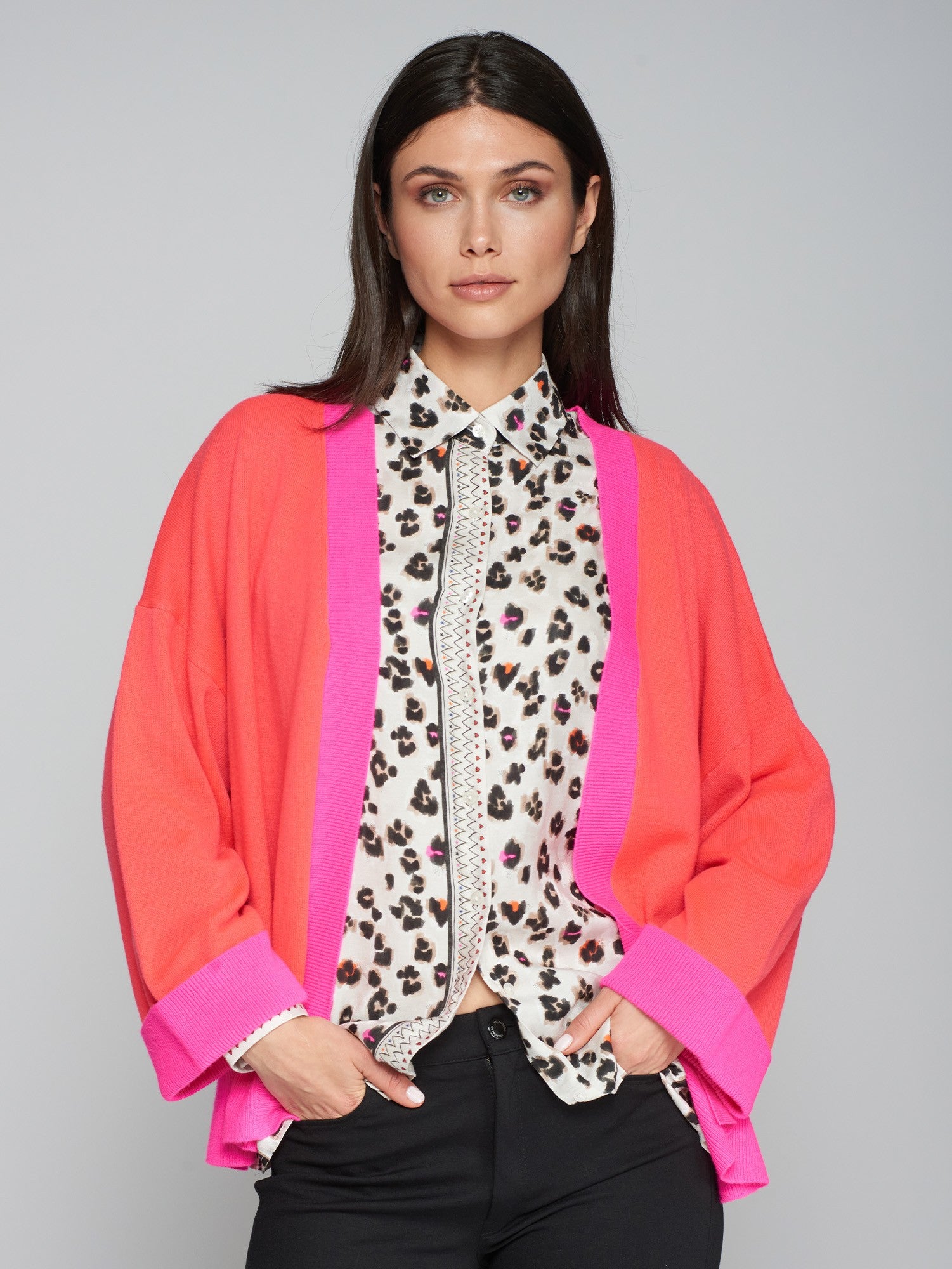 This cardigan features a trendy pink and coral red colour blocked design, perfect for adding a bright touch to your outfits. With an open design, this cardi is perfect to be paired over t-shirts or blouses.