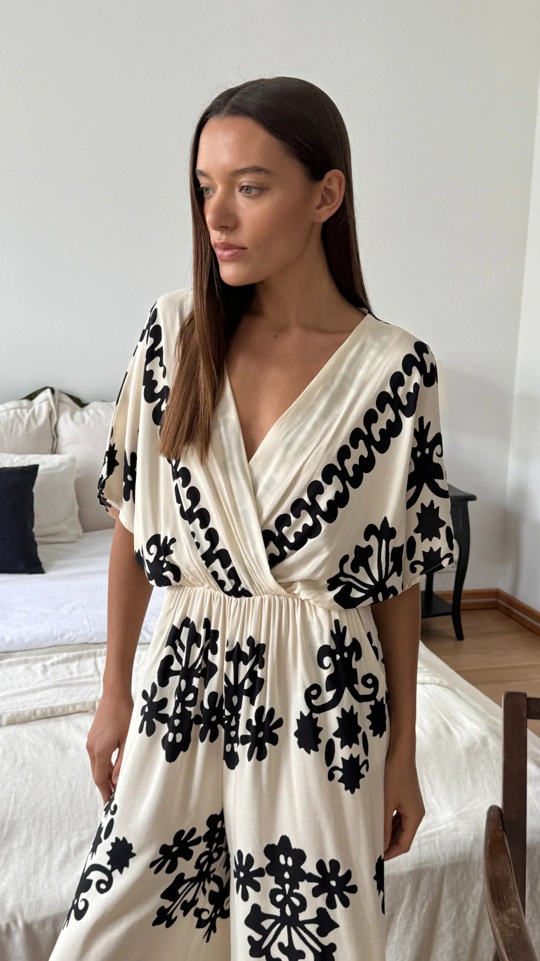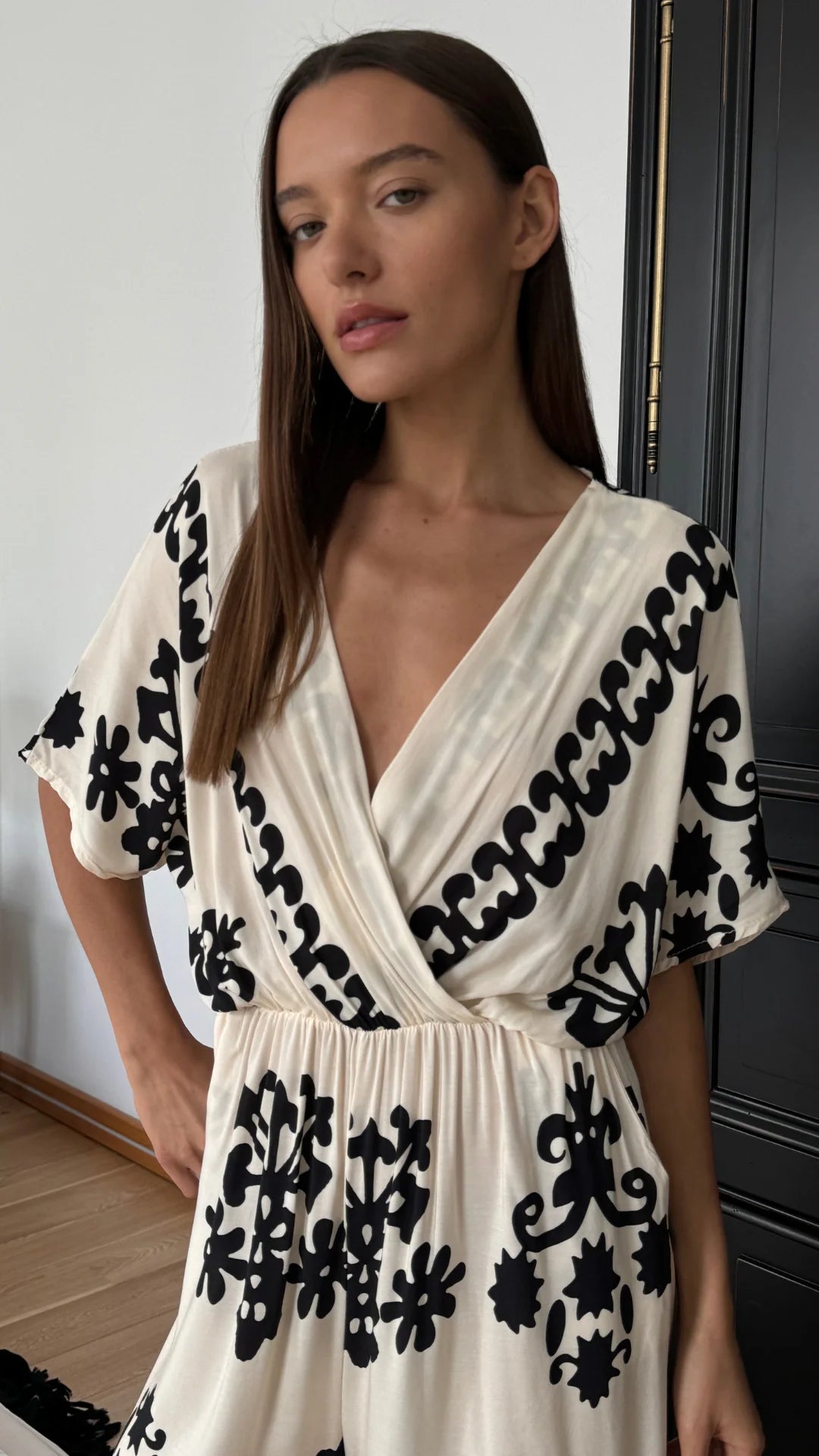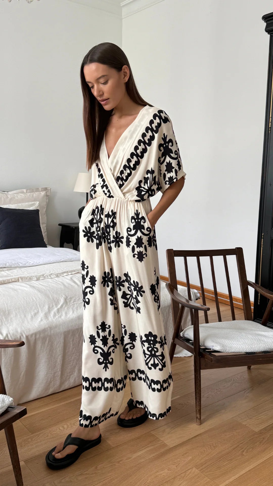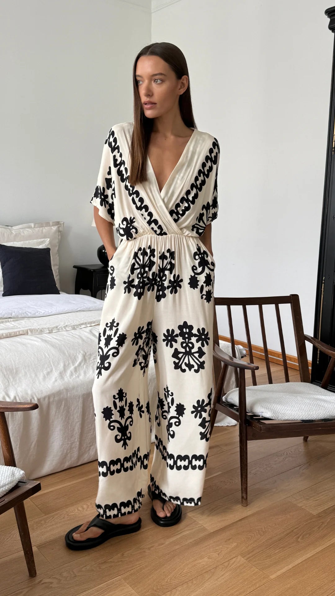 Channel your inner fashionista with the Molly Jumpsuit in classic ivory. This relaxed jumpsuit features a unique pattern and a draped design for a relaxed vibe. Stay comfortable with its easy fit that will have you looking effortlessly chic.