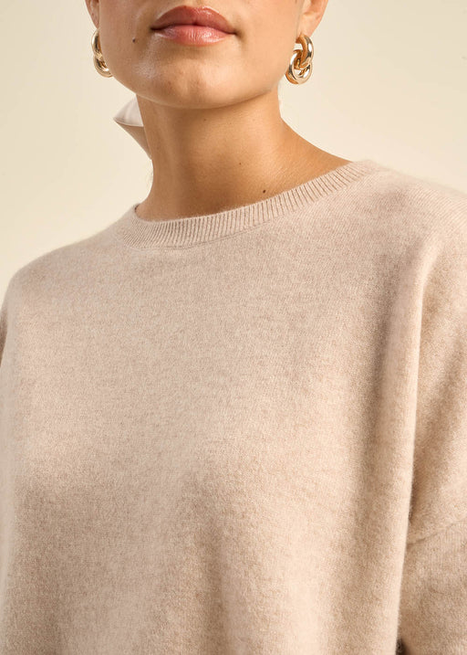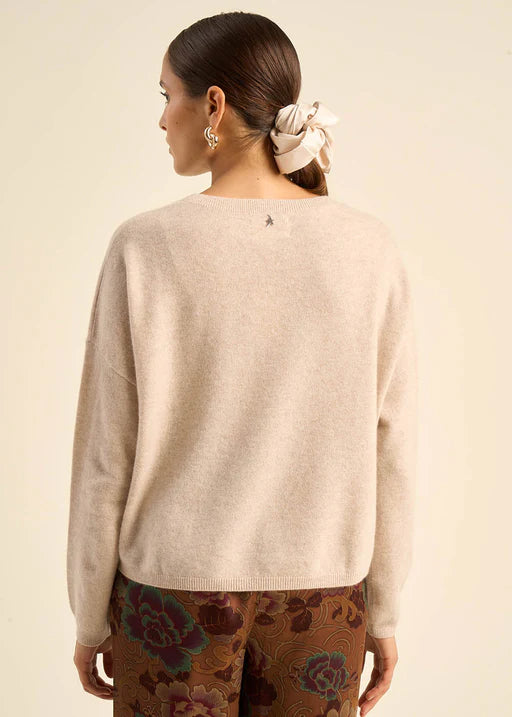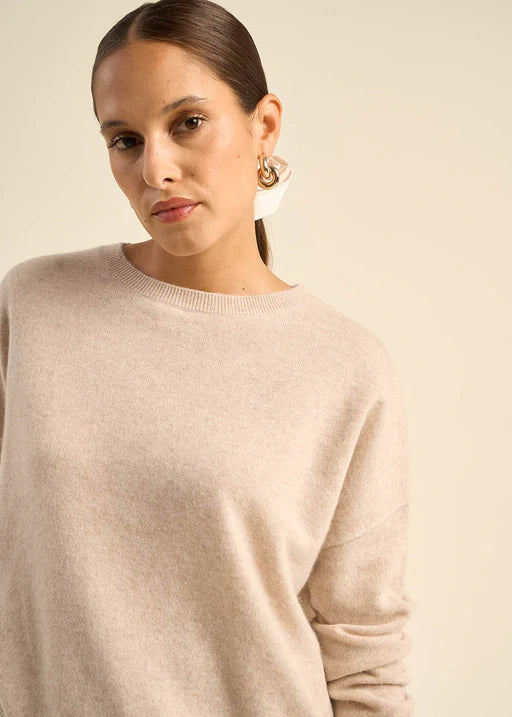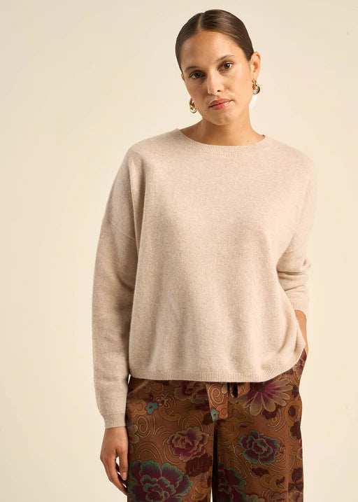 This beautiful cashmere sweater will become your go to for casual days. The bateau neckline and long slim-fit sleeves add a touch of elegance to this classic style. The boxy fit complements the feminine shape, making it perfect for any occasion, simply pair with your favourite pair of wide-leg jeans and Victoria trainers.