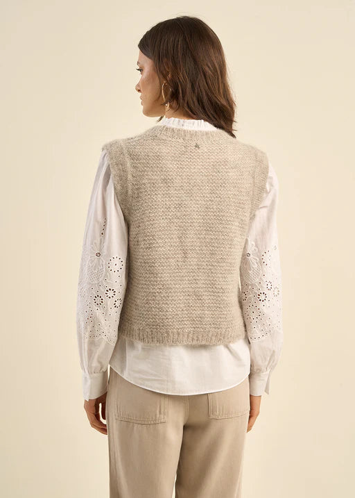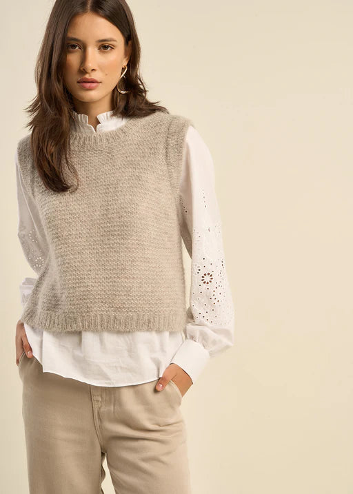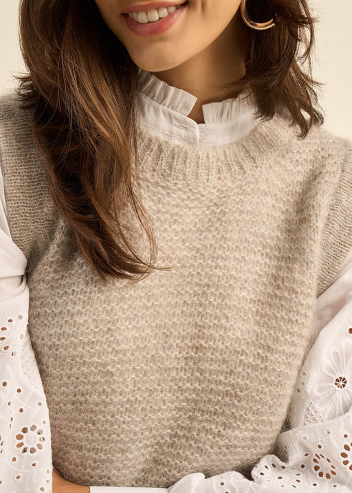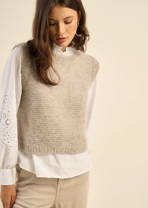 This sleeveless sweater vest is an autumn essential. In a knitted style, made from a striking wool blend, this piece is perfect for layering, whether it be over dresses, shirts or t-shirts. The ribbed finishes add some detail to this boxy style.