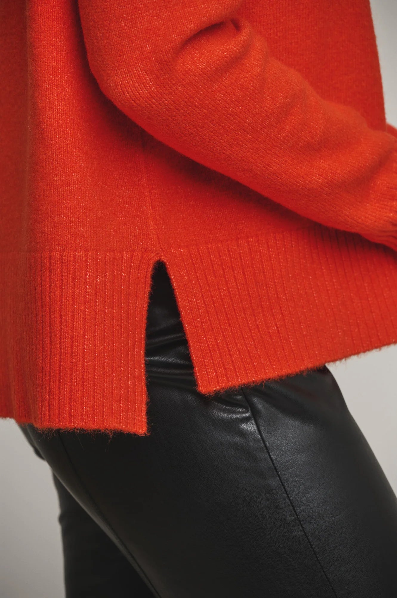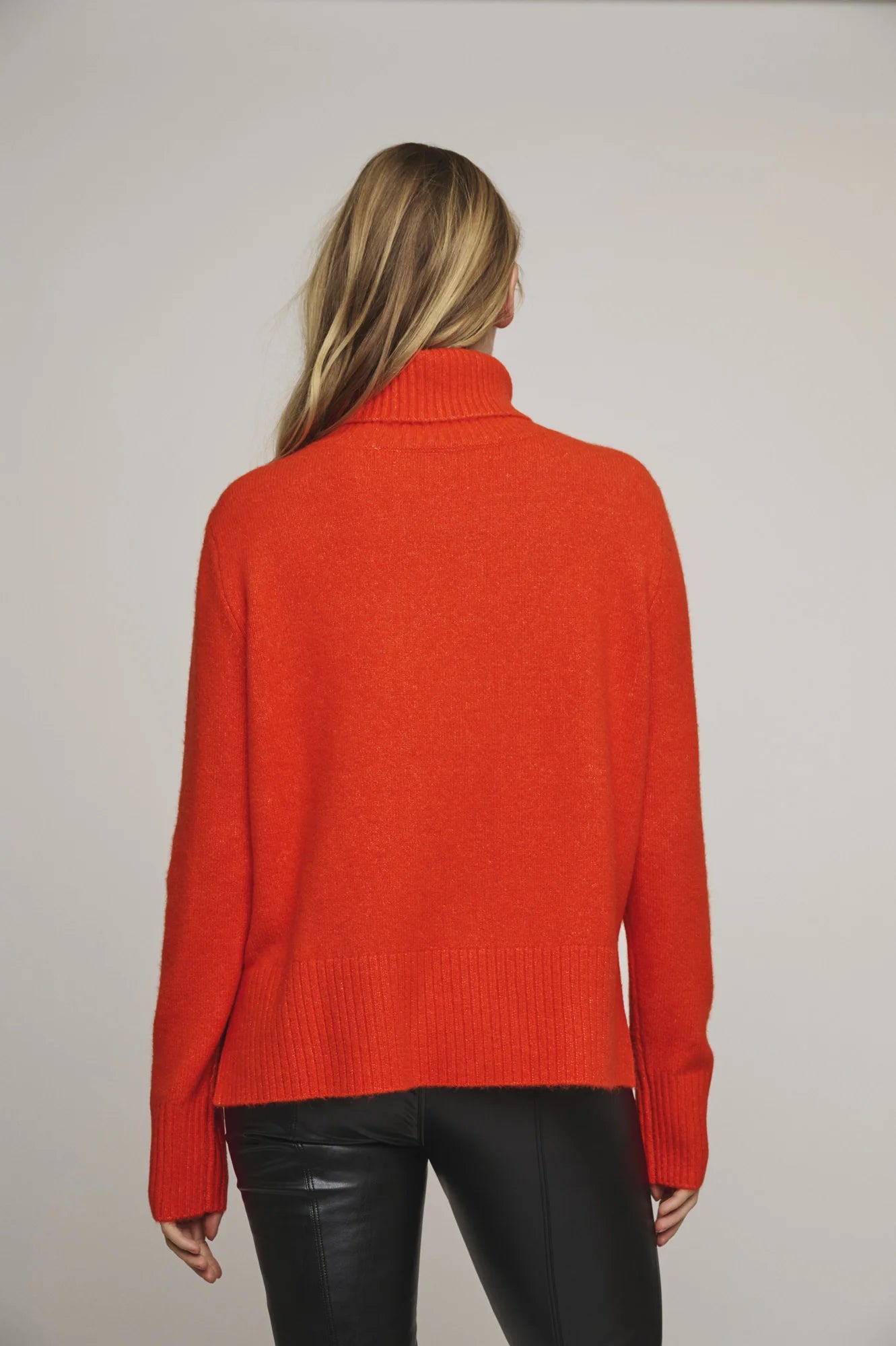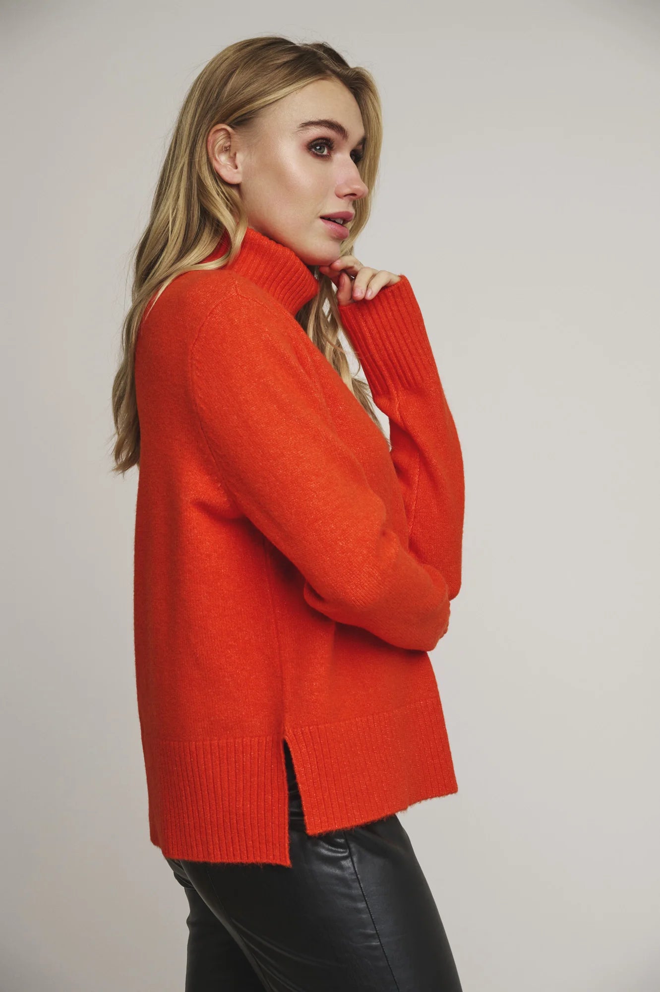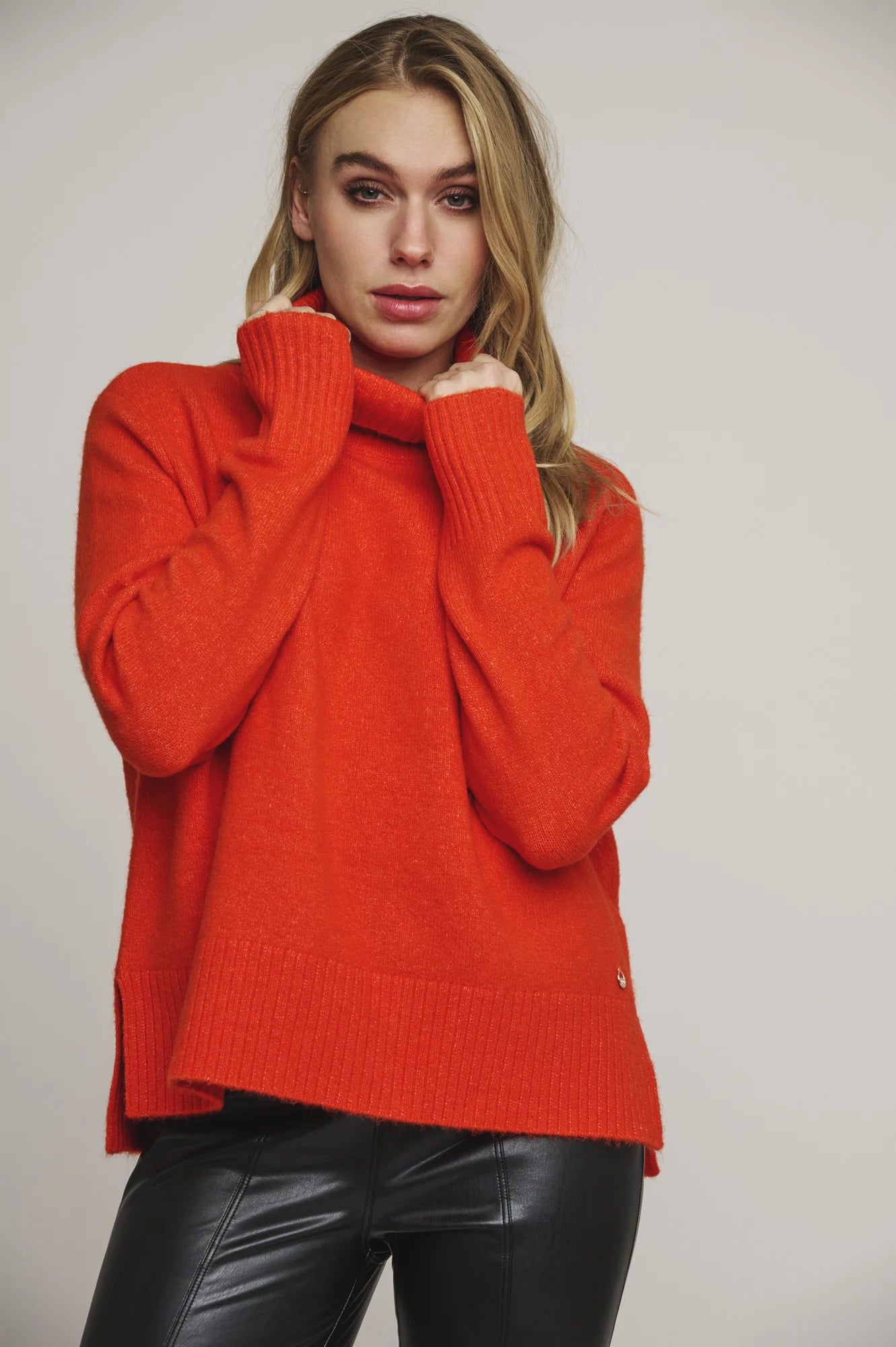 This classic oversized turtleneck sweater is a must have for this winter. In a bright and vibrant orange, this jumper will brighten up any winter day. The ribbed details at the sleeves and bottom adds some extra casual details.