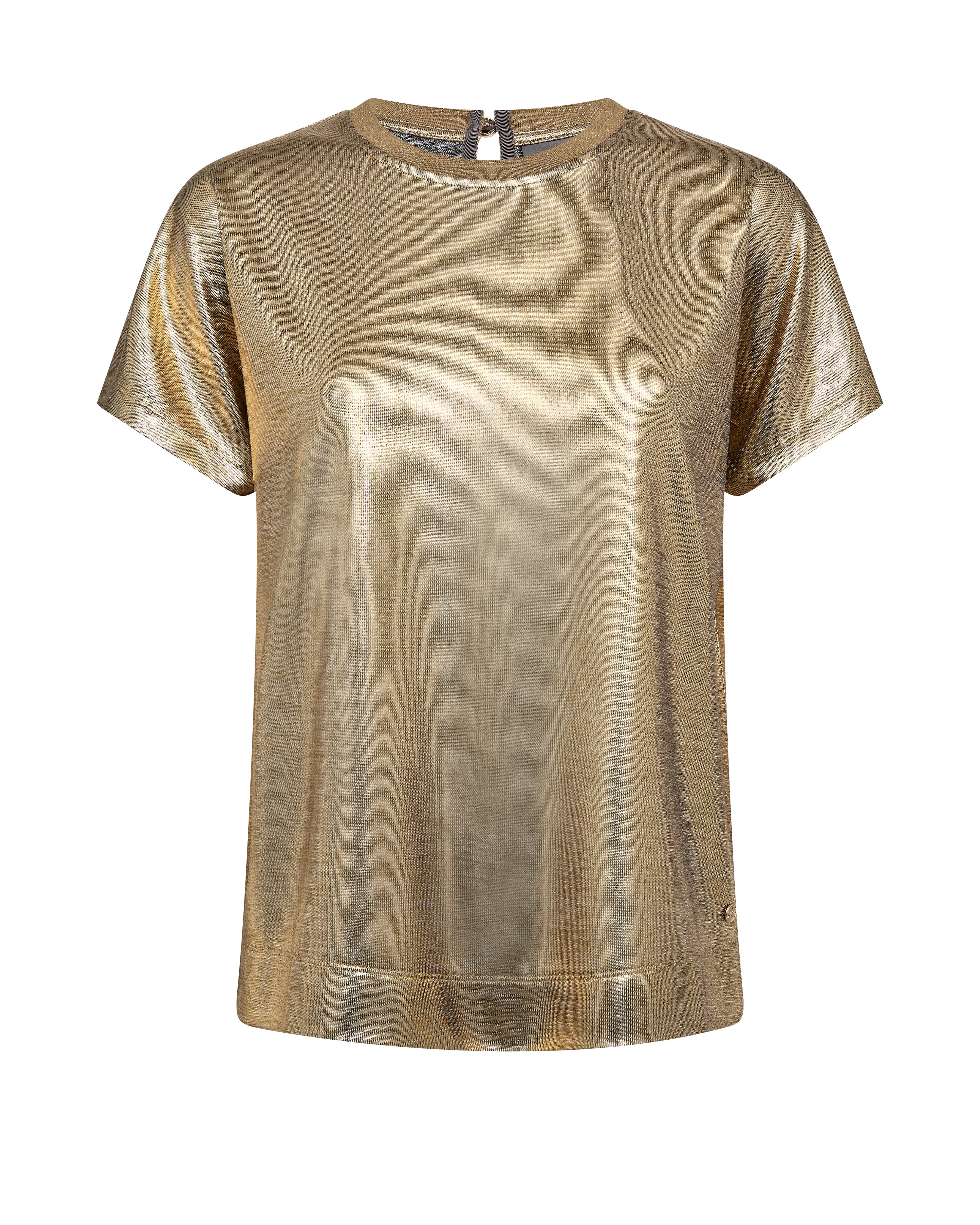 This fashionable t-shirt boasts a stunning foil effect that will catch everyone's eye. Its round neckline and loose fit provide optimal comfort, while the ribbed detail adds a touch of casual sophistication. Perfect for a winter night out with a pair of wide leg black jeans.