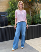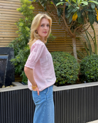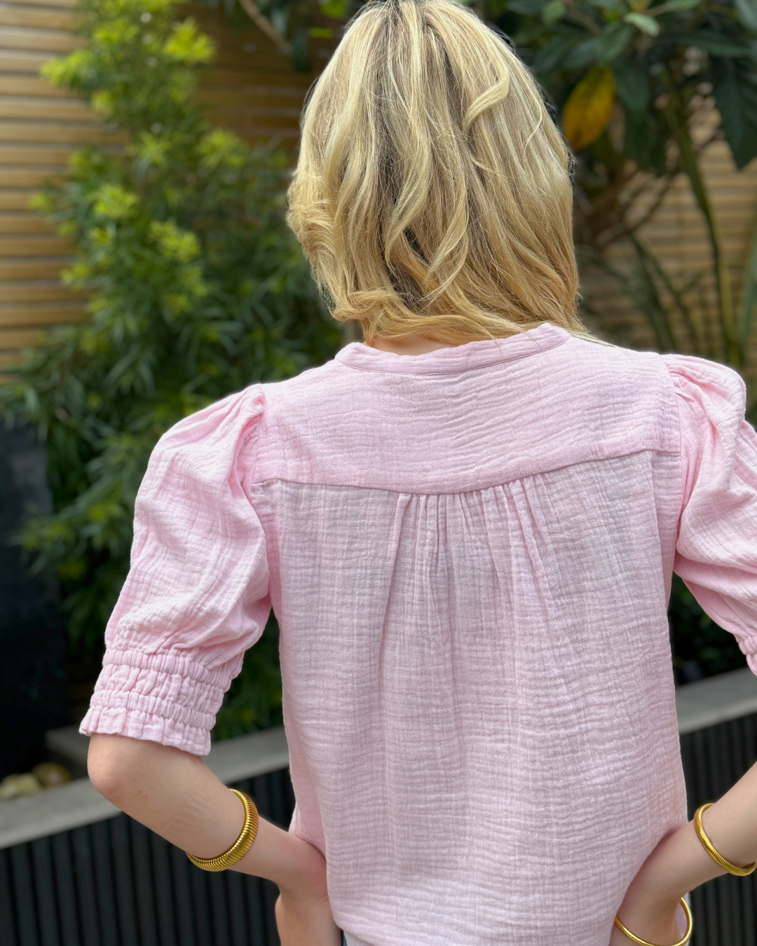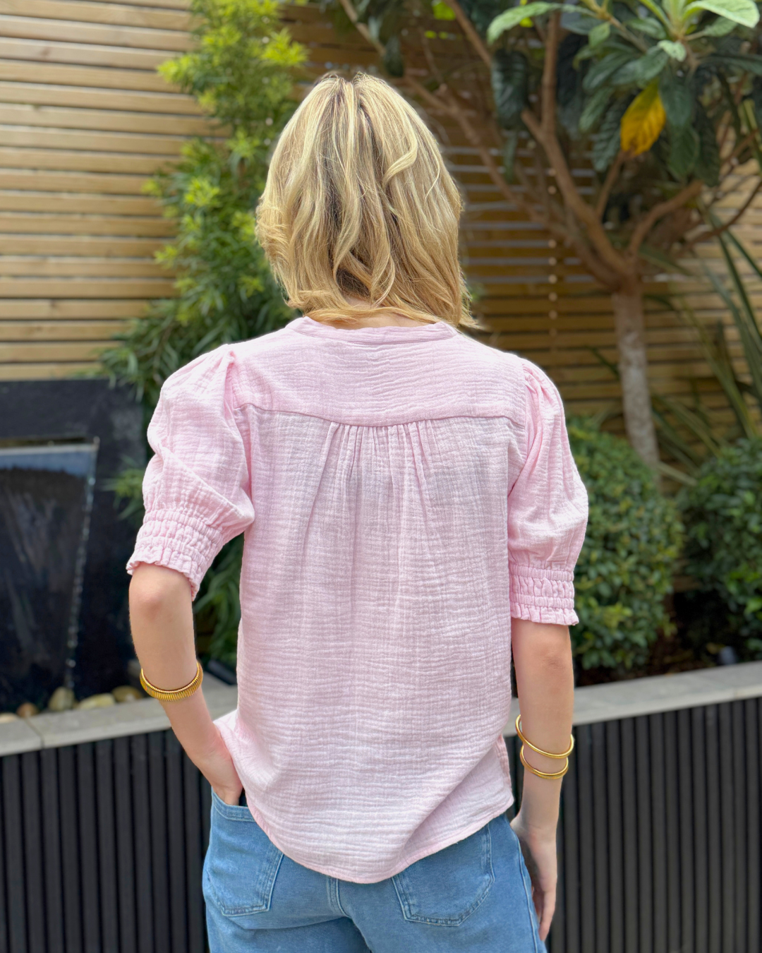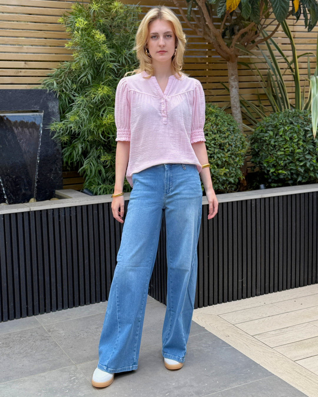 This beautiful shirt is made of summery cheesecloth cotton and gives any outfit that playful feminine touch without the effort. The short sleeves have a gentle puffed effect to them, to create shape and movement in any outfit. We think classic denim really helps this colour to pop!