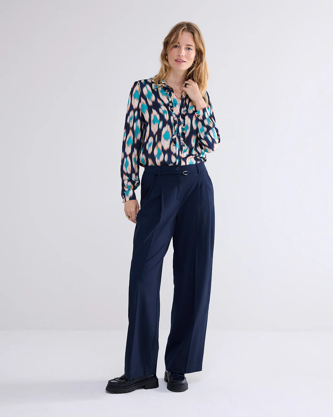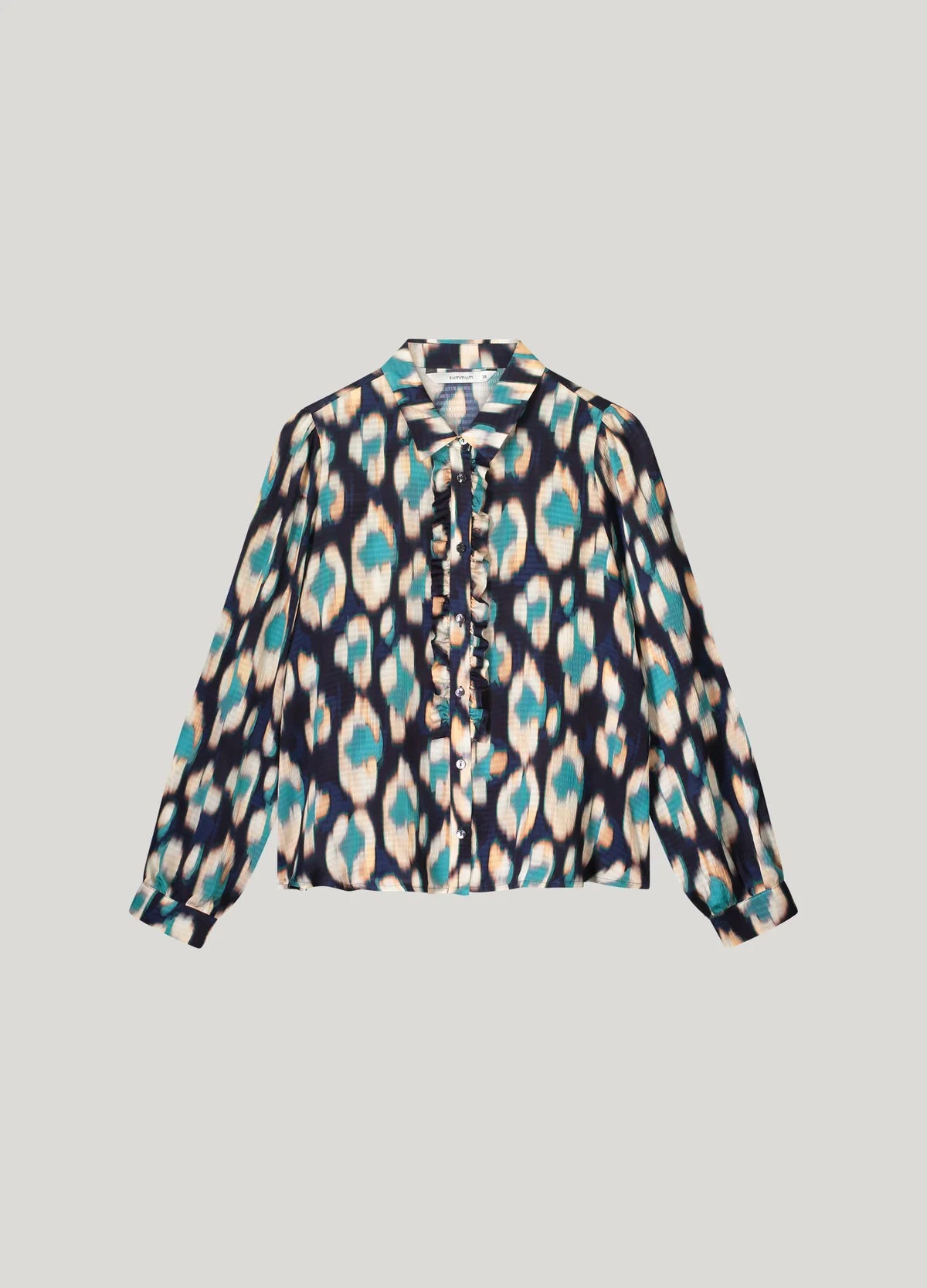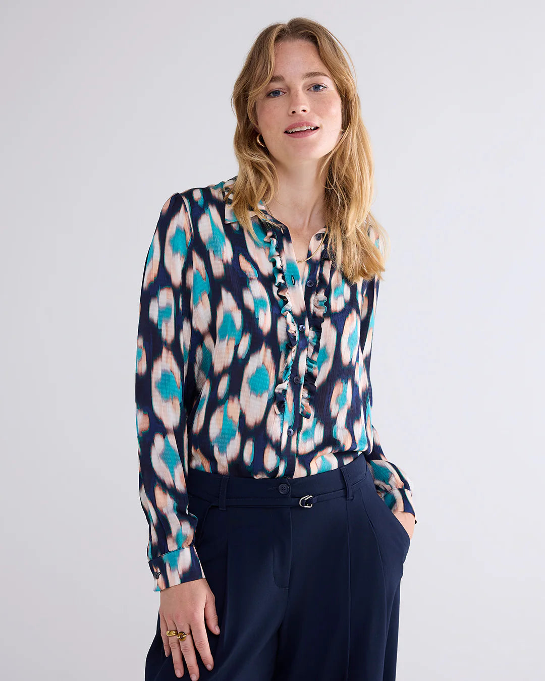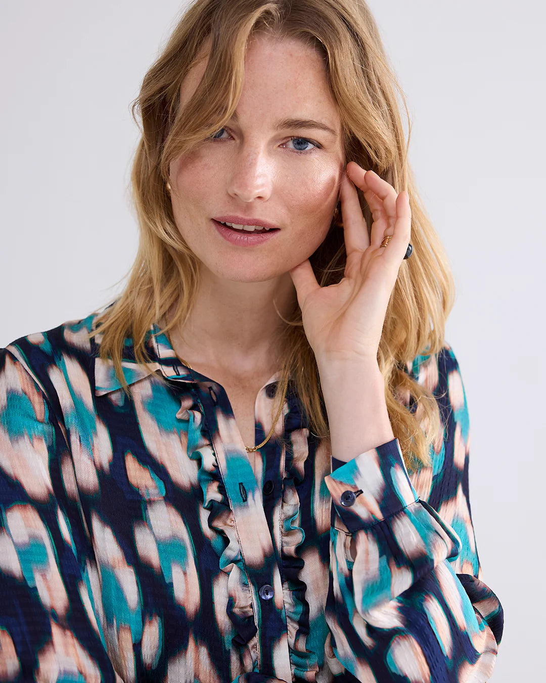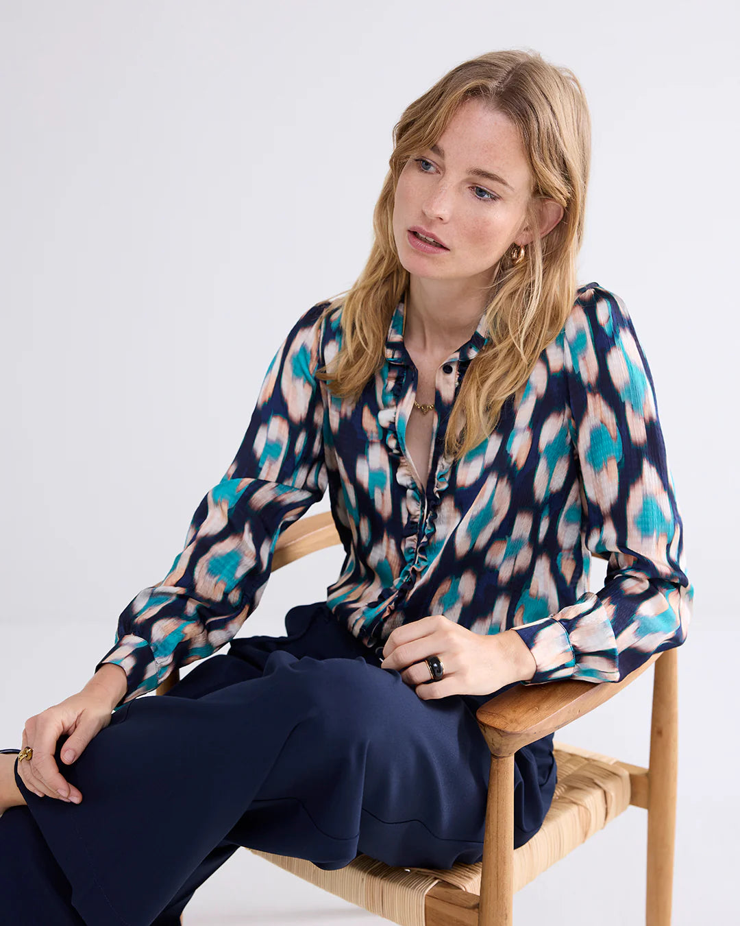 This statement blouse features an all over ikat print. The ruffled detail down the button placket on the front adds a unique touch to this classic collared blouse. Pair with tailored trousers for work or tuck into your jeans for a casual look.