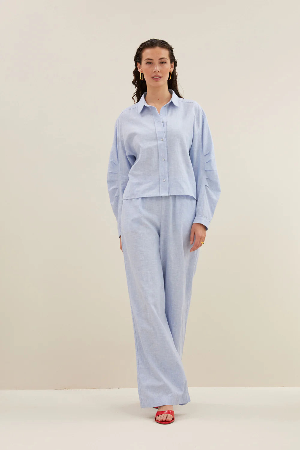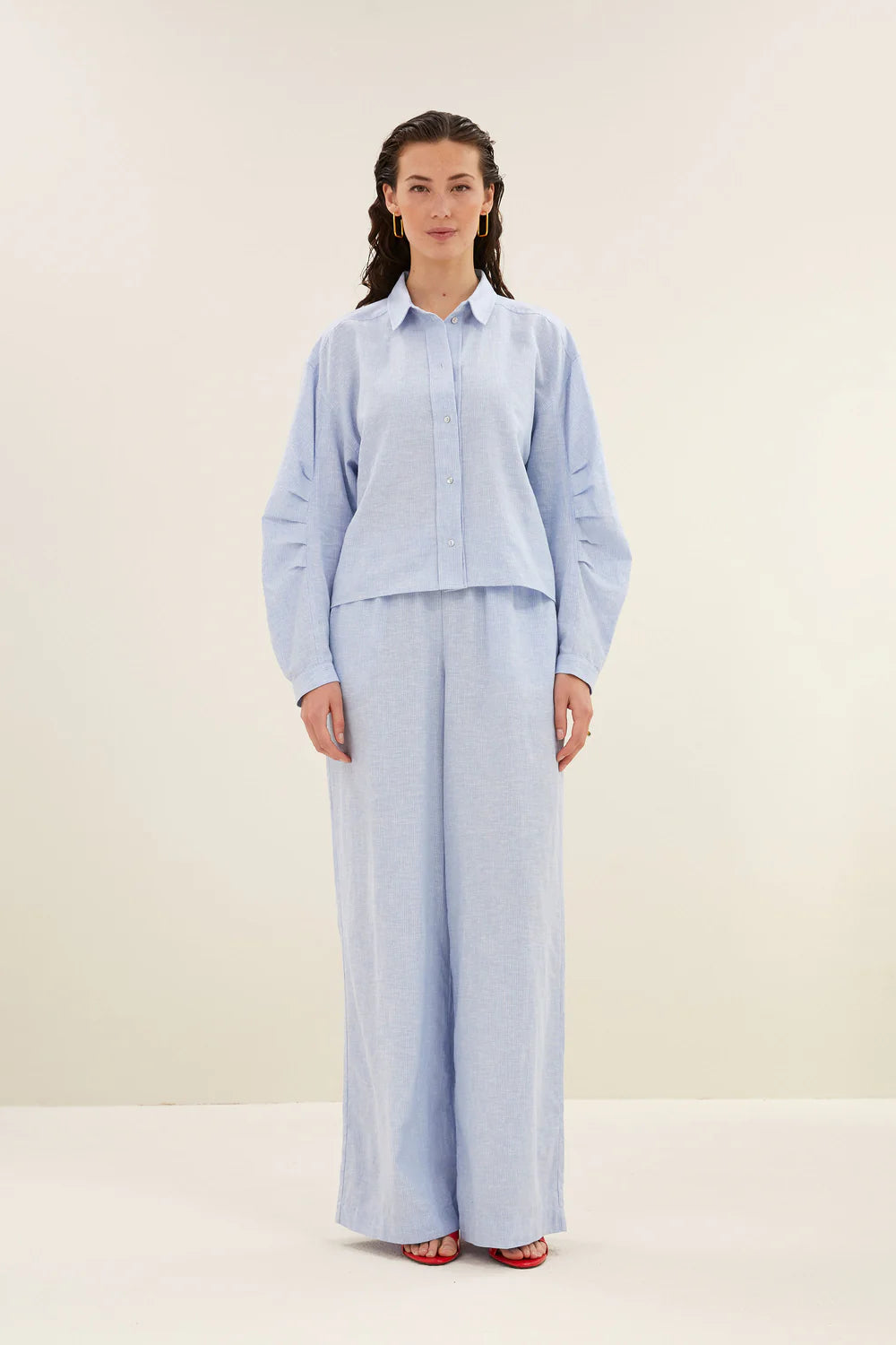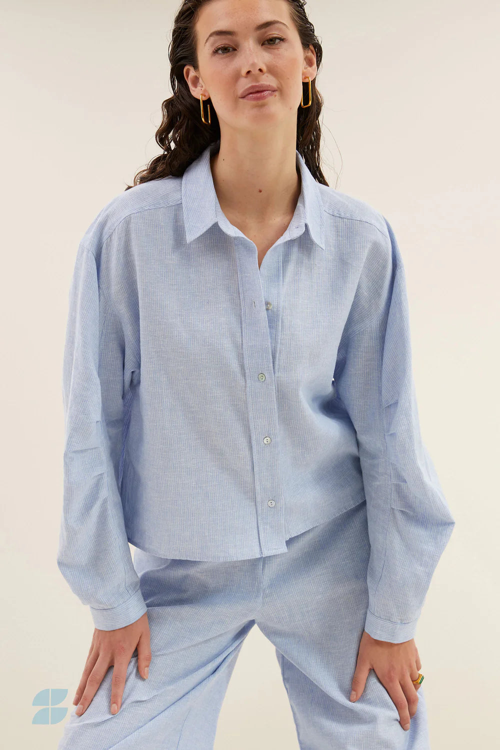 A wardrobe without a crisp button up shirt simply doesn't work! This blouse is a modern take on your classic shirt, with voluminous sleeves for a feminine finish. The traditional elements like the stand up collar and pinstripe design compliment this flattering style.
