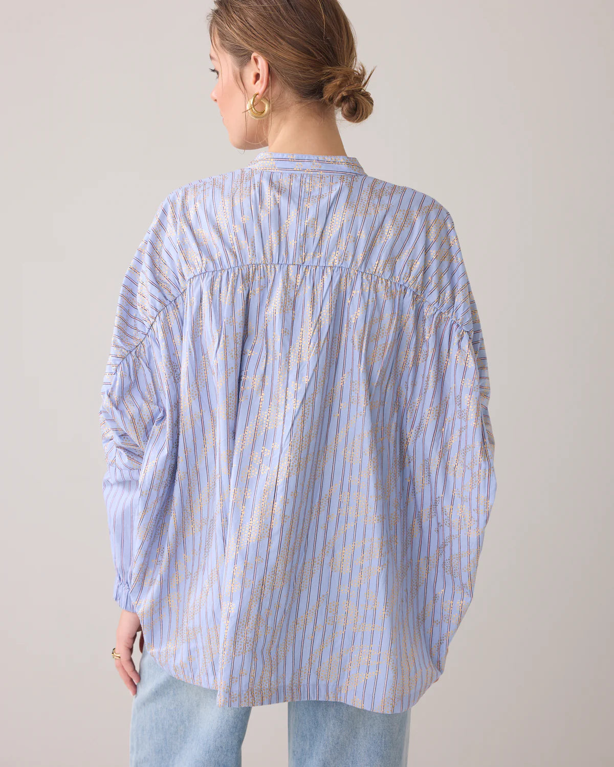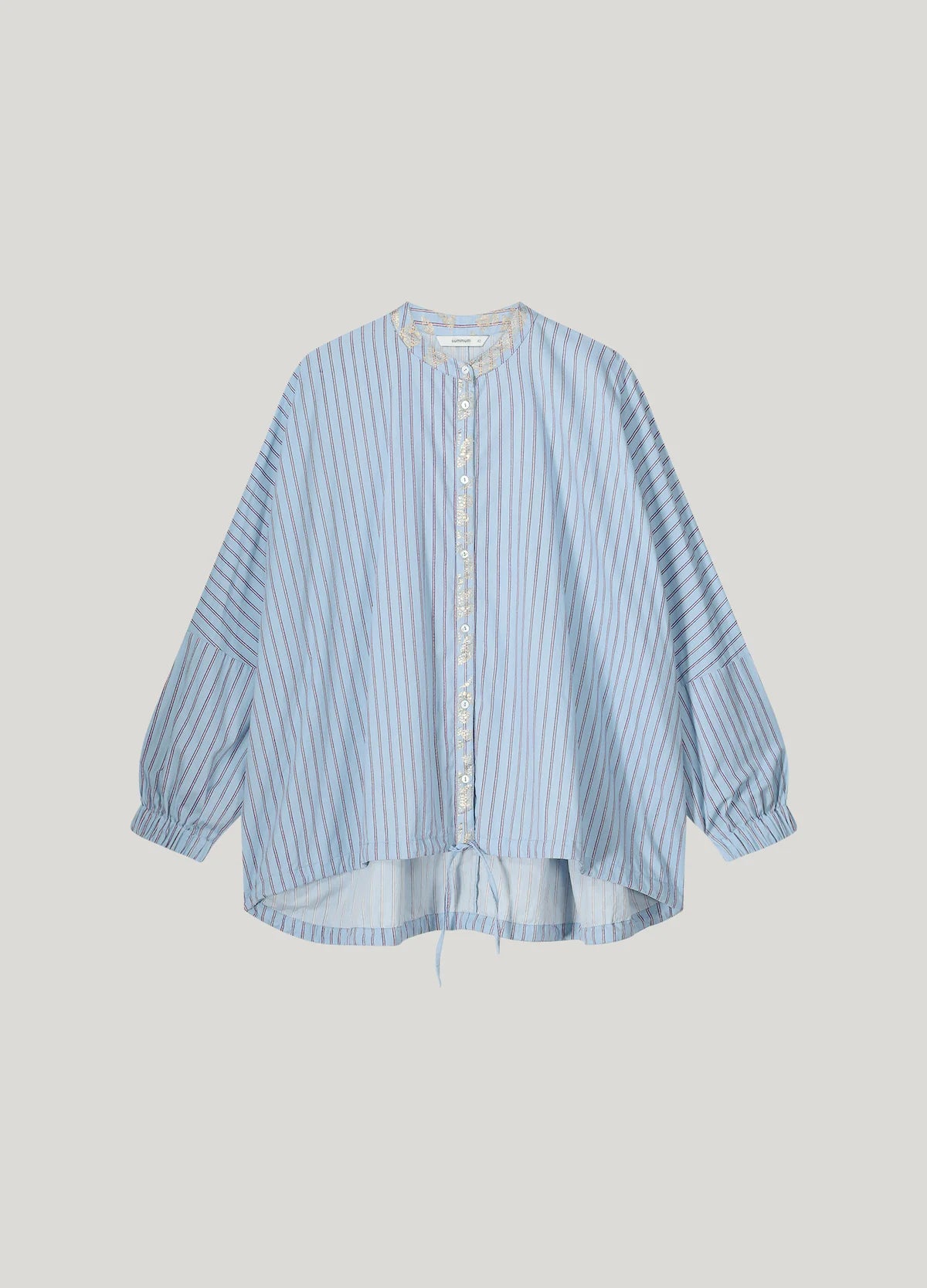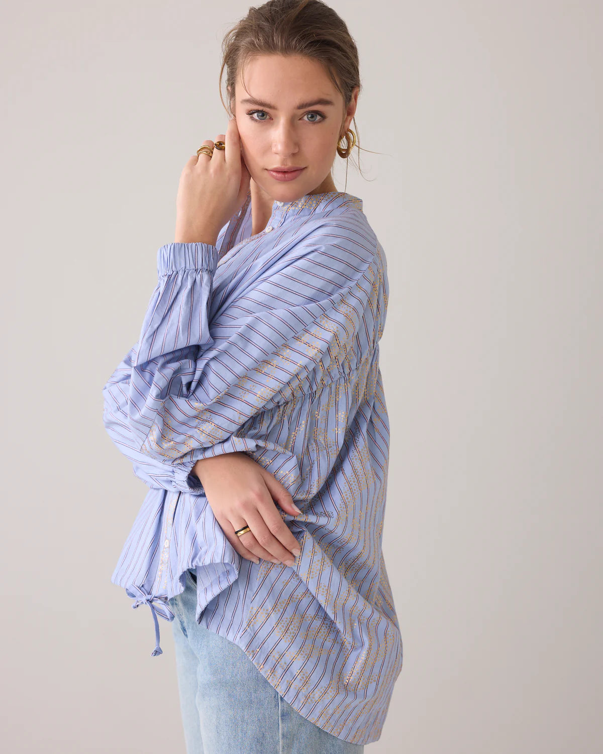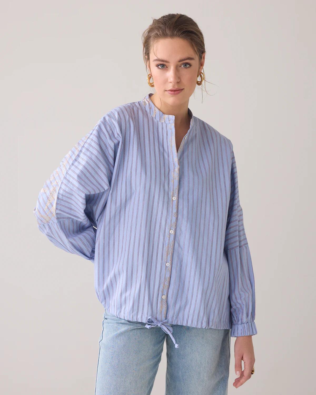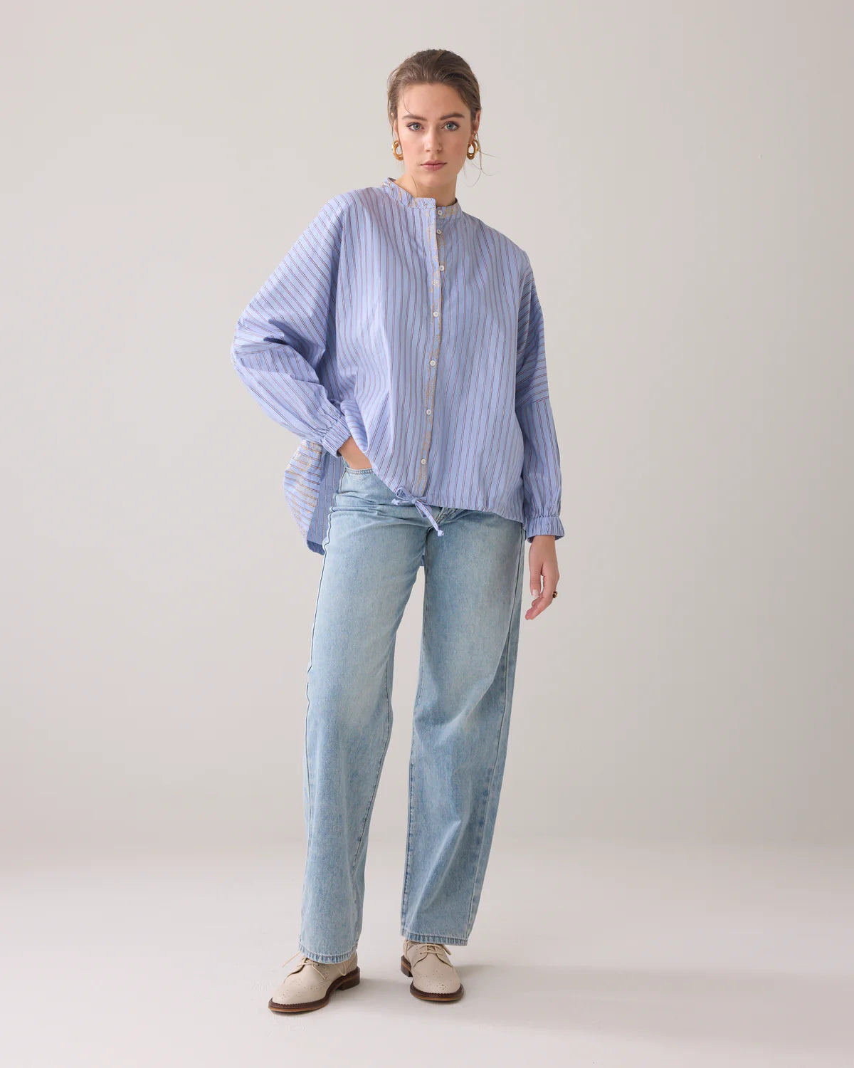 Pinstripe Shirt With Drawstring Hem - Powder Blue