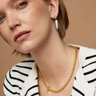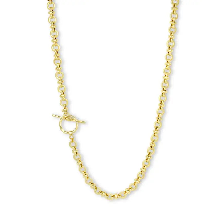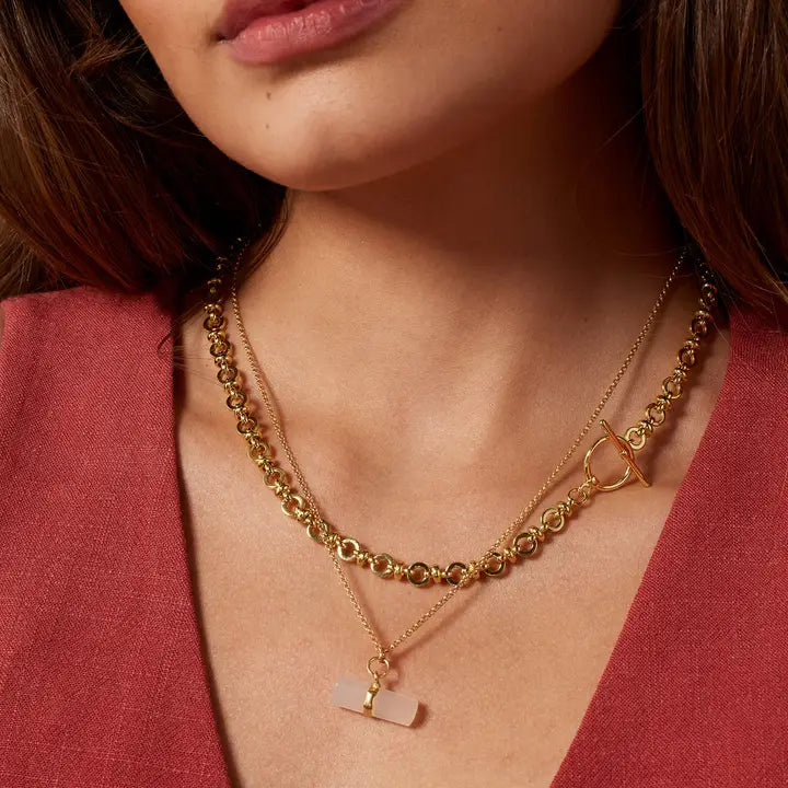 This t-bar necklace is an everyday essential, perfect for casual wear on its own or for layering up with other chains and pendants. Made from gold plated brass, this beautiful necklace is a striking yellow gold colour and flatters any skin tone.