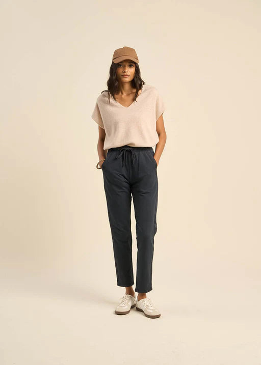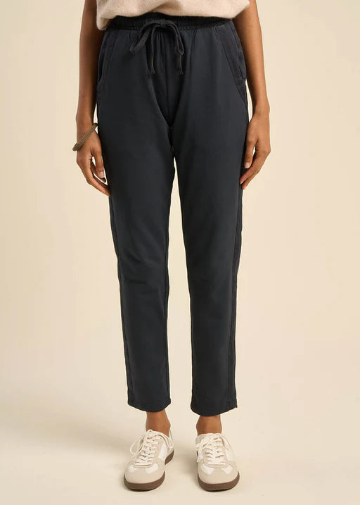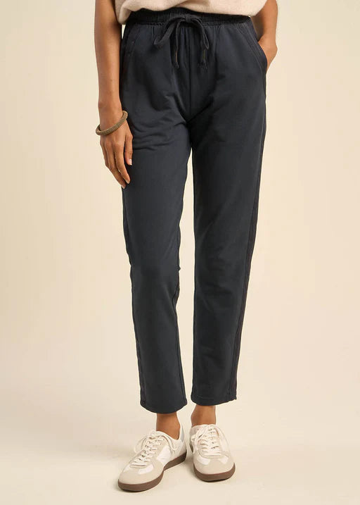 Upgrade your loungewear with our Poery Trouser in Marine. These fashionable jogger style pants feature an elastic waistband with a drawstring for added comfort. The Italian style pockets add a touch of luxury, while the satin piping down the leg elevates your look.