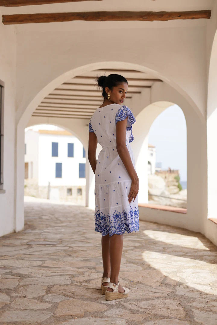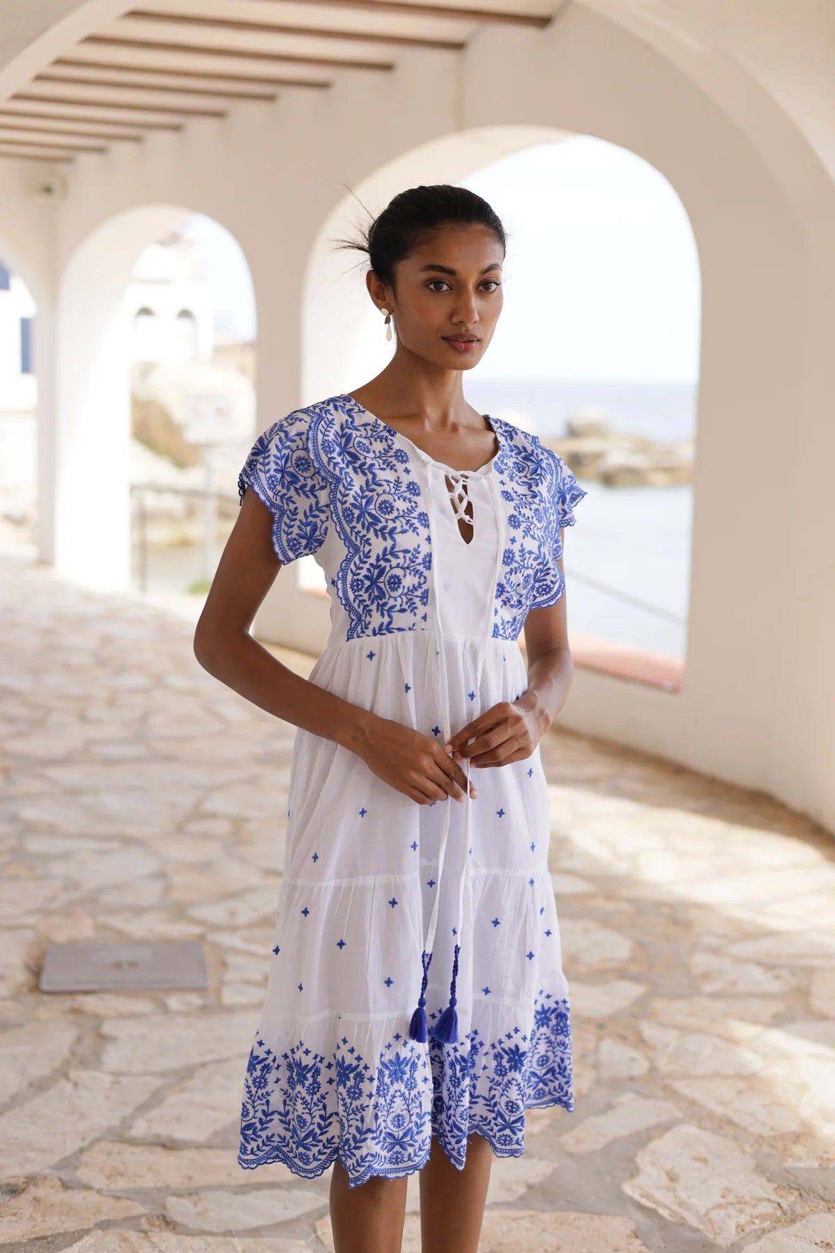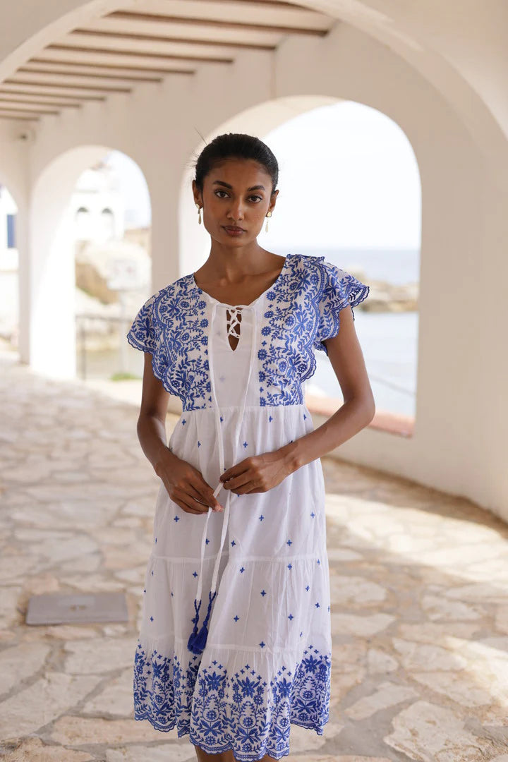 This sweet midi dress is adorned with striking blue embroidery. The round neckline is finished with tassel ribbons for a beachy boho look. The Puglia dress has a tiered skirt finished with Mediterranean patterns perfect for a trip abroad.