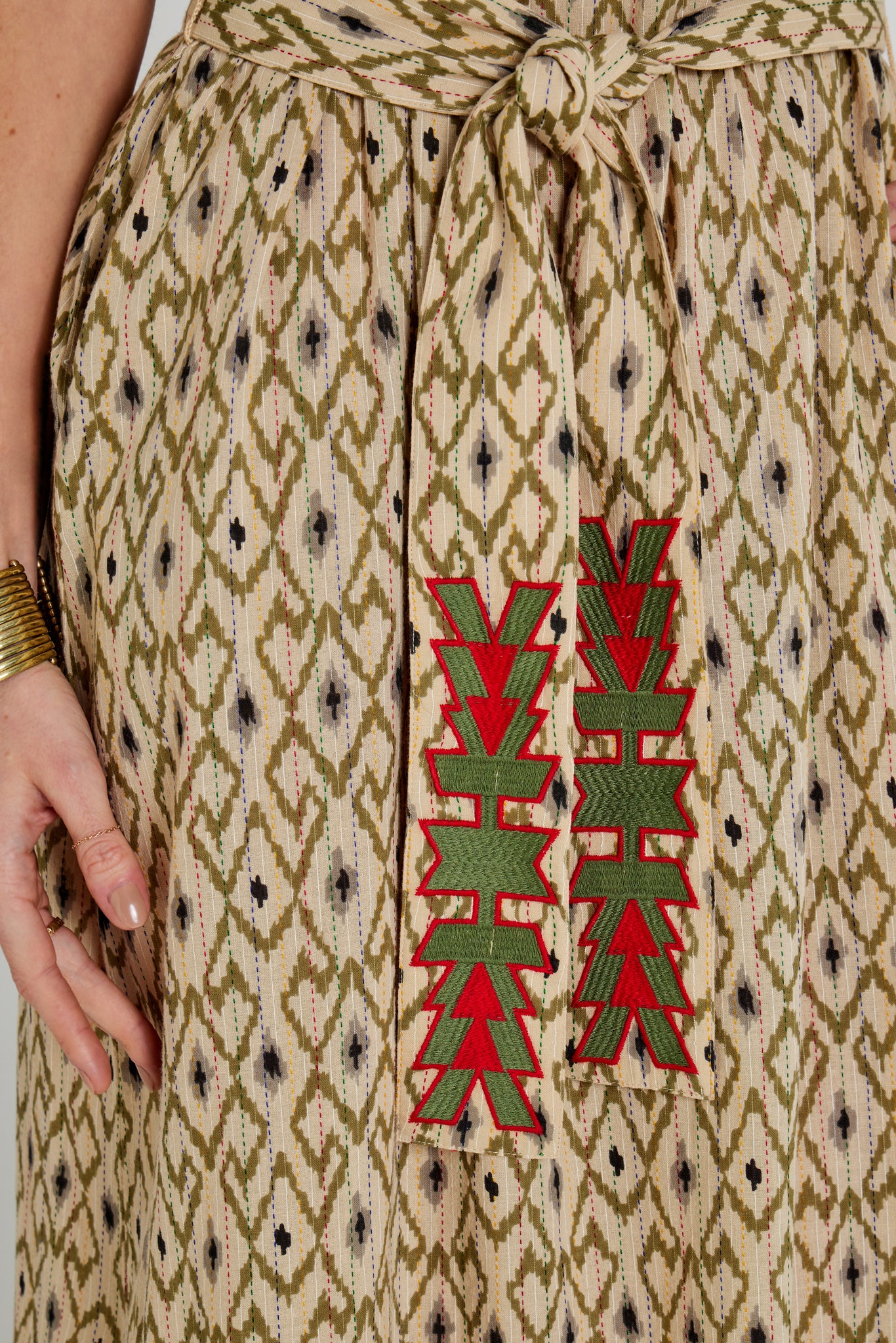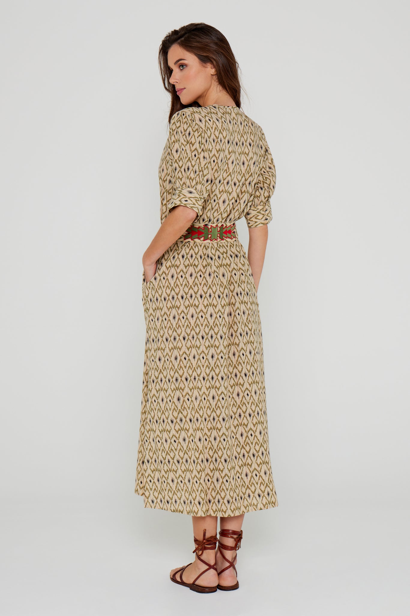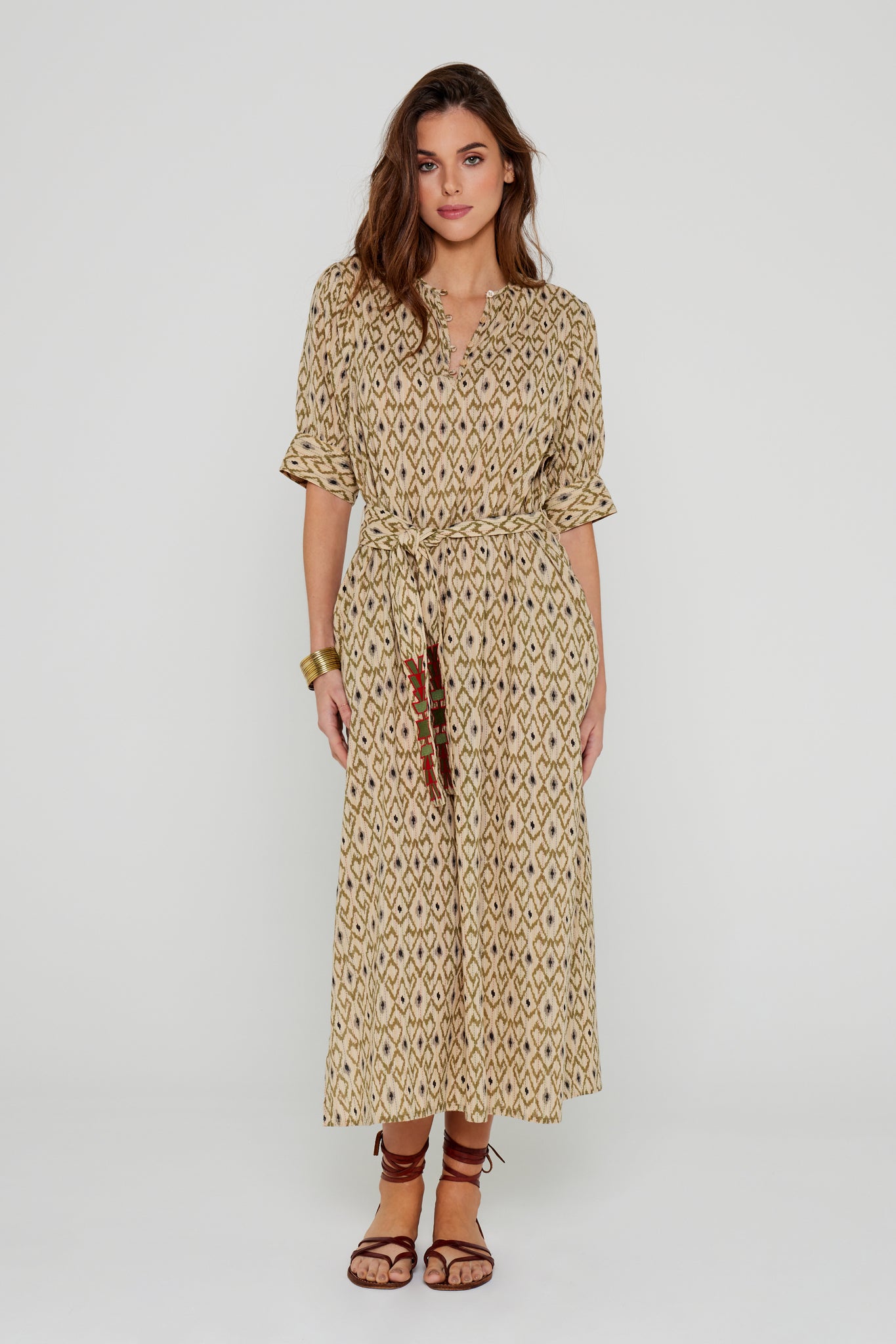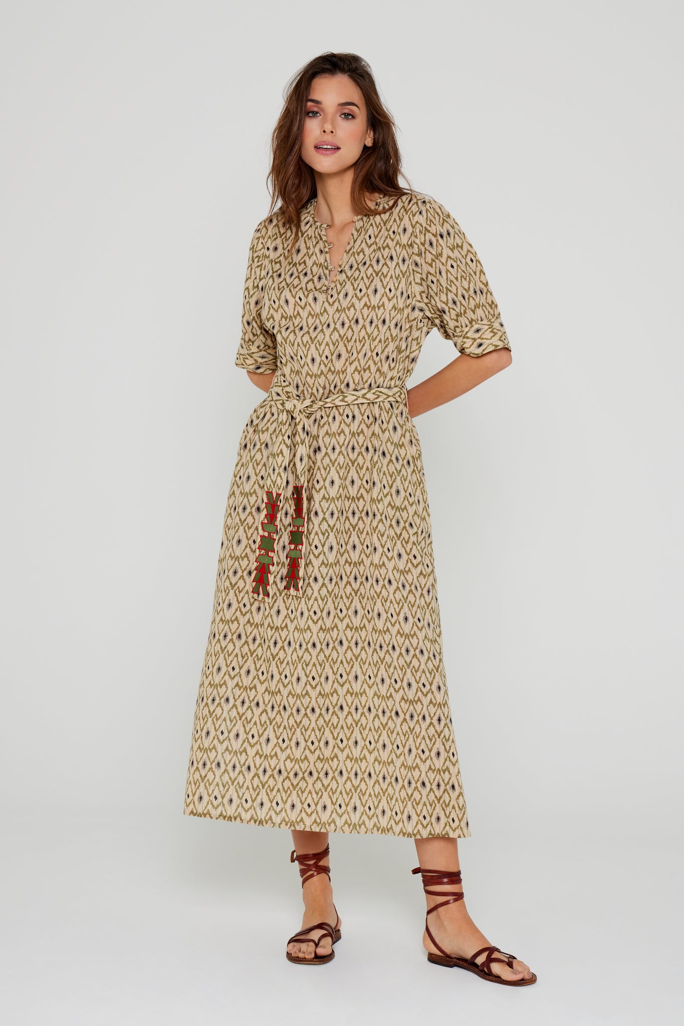 The Ravi Dress is both fashionable and functional. Its Tunisian collar and half sleeves add a touch of elegance, while the printed design and belt detail tie everything together for a chic look. In an earthy colour palette, this dress combines bohemian style with everyday versatility.