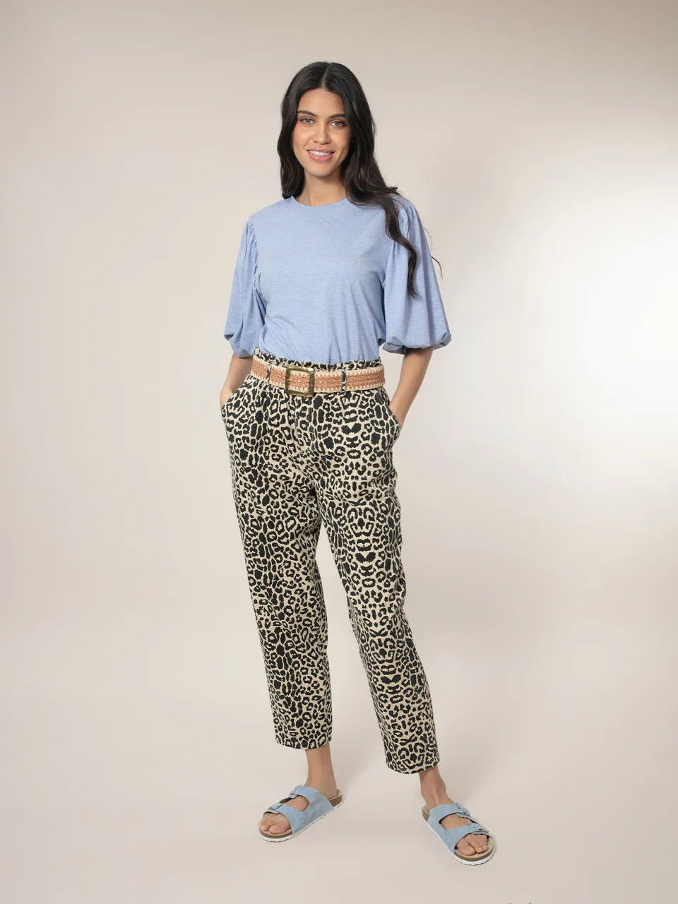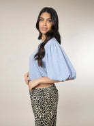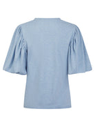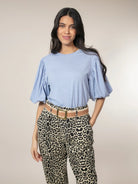 This top takes your usual t-shirt and makes it better. With beautifully puffed sleeves for drama and coloured flecks in the fabric, this top is sure to make your casual outfits a whole lot better. We think this tee looks great under a gilet with your favourite denim jeans.