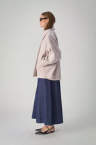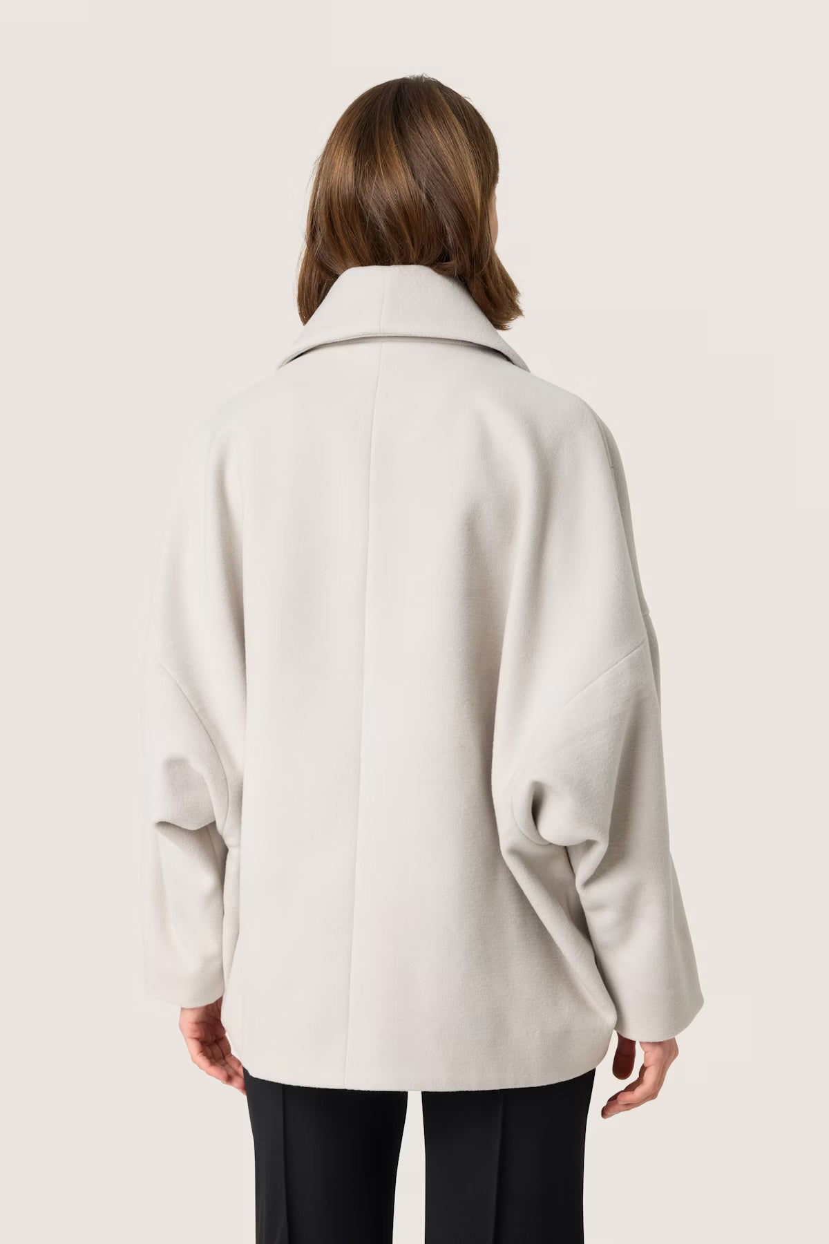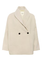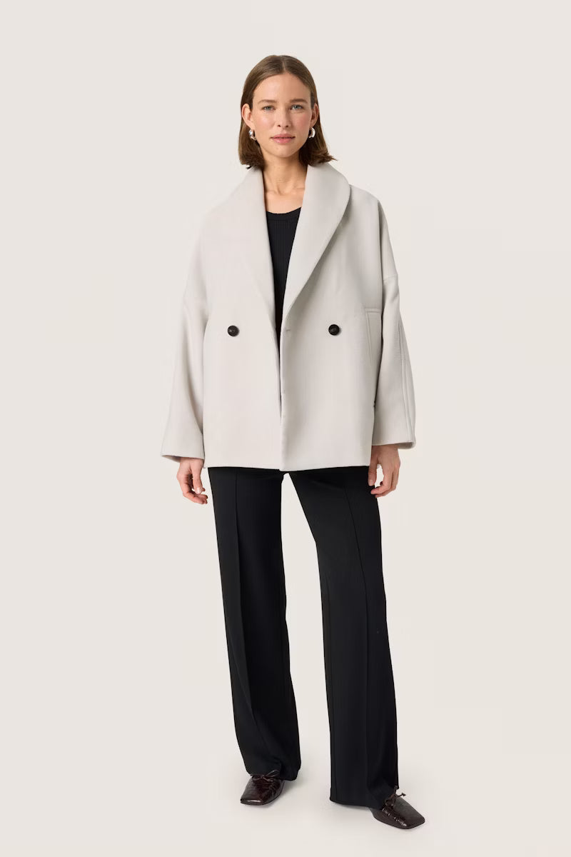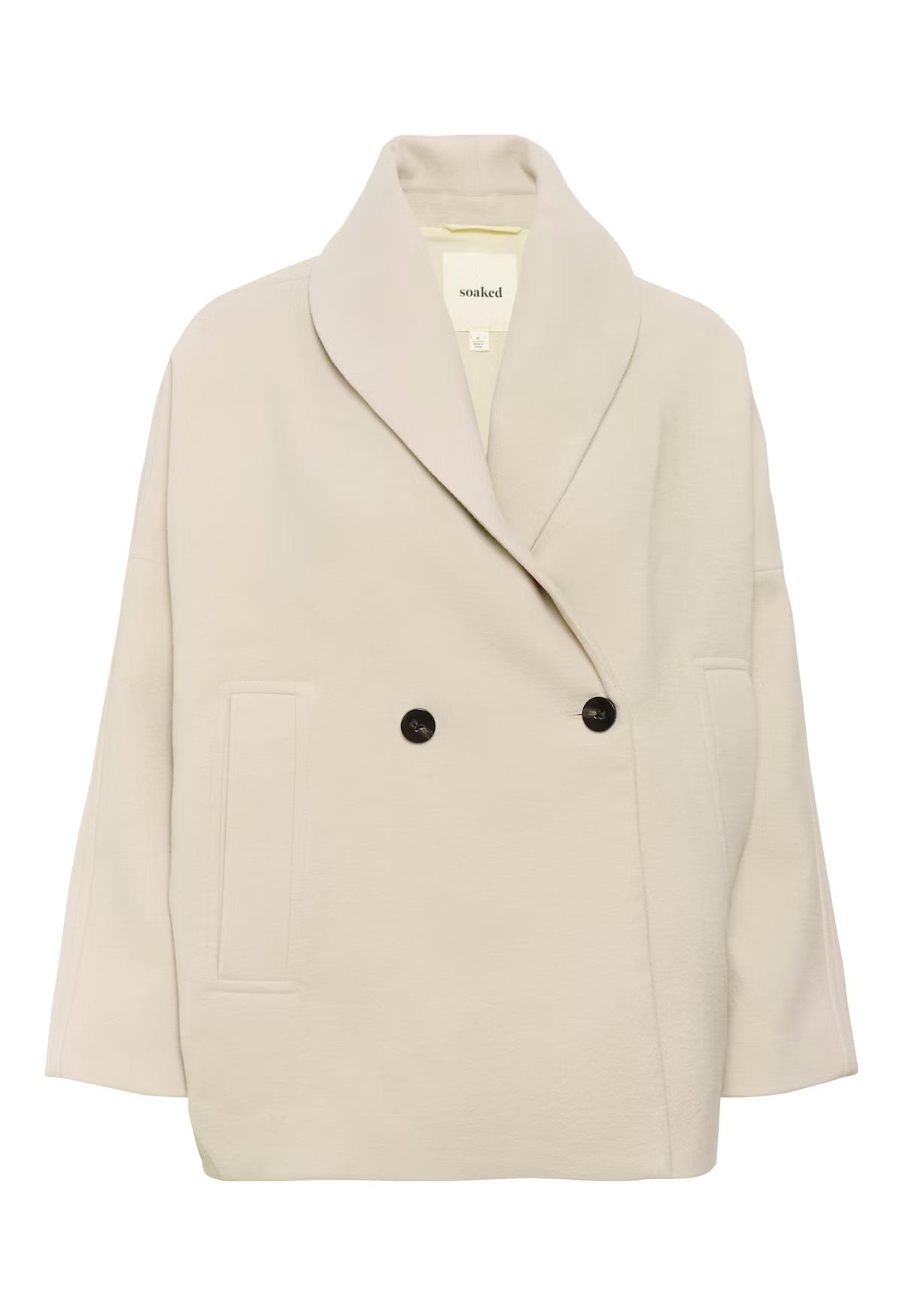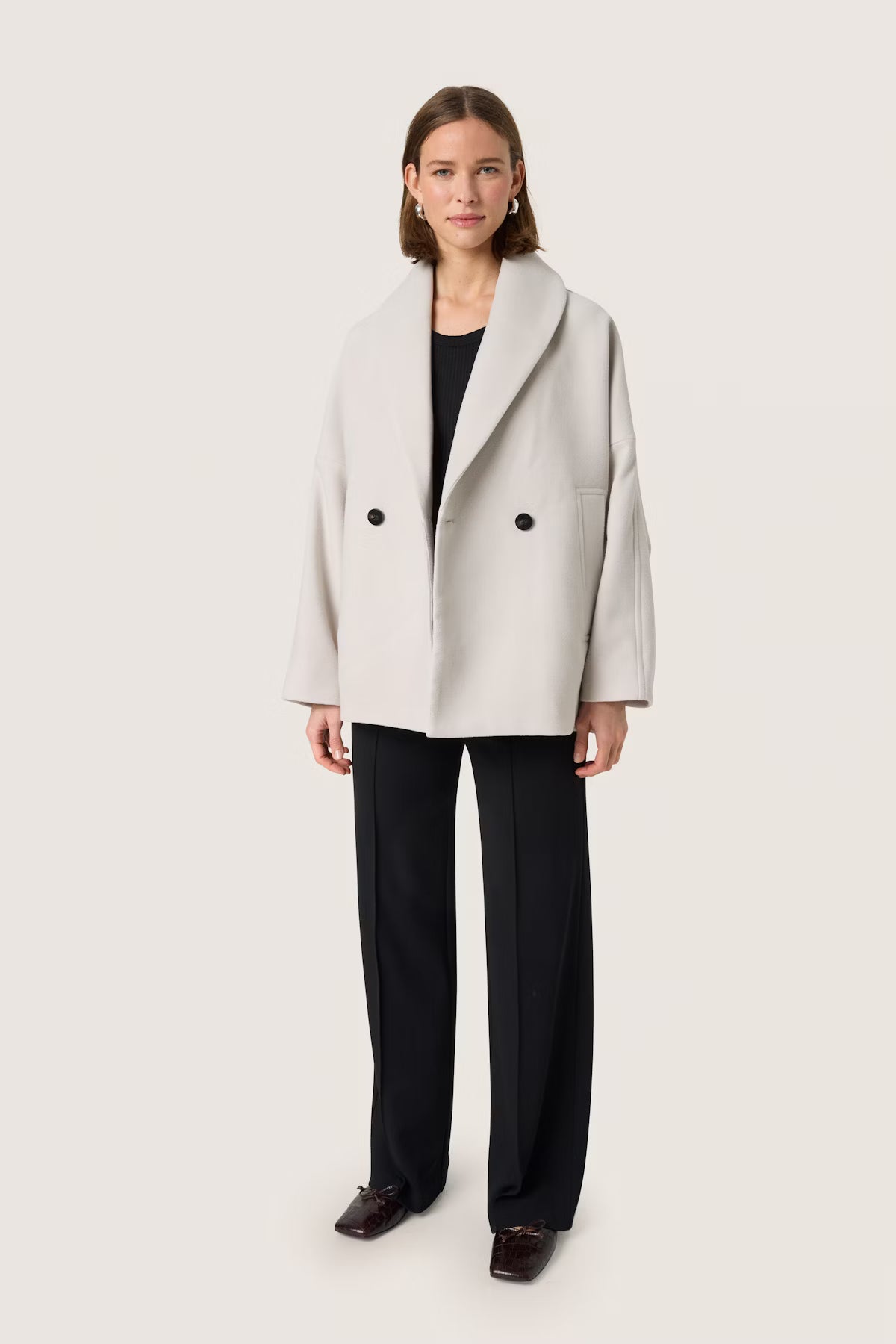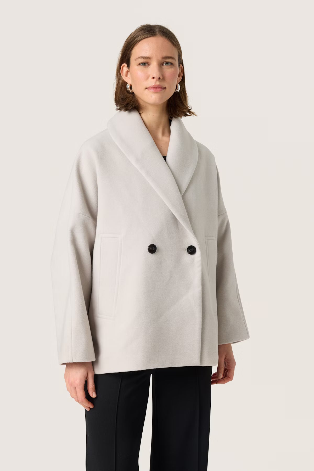 This short coat is a neutral layering piece, great for matching almost any outfit. With classic tailoring elements like a double-breasted closure and flattering shawl collar, this minimalist coat ensures that all your looks stay elegant and timeless this winter.