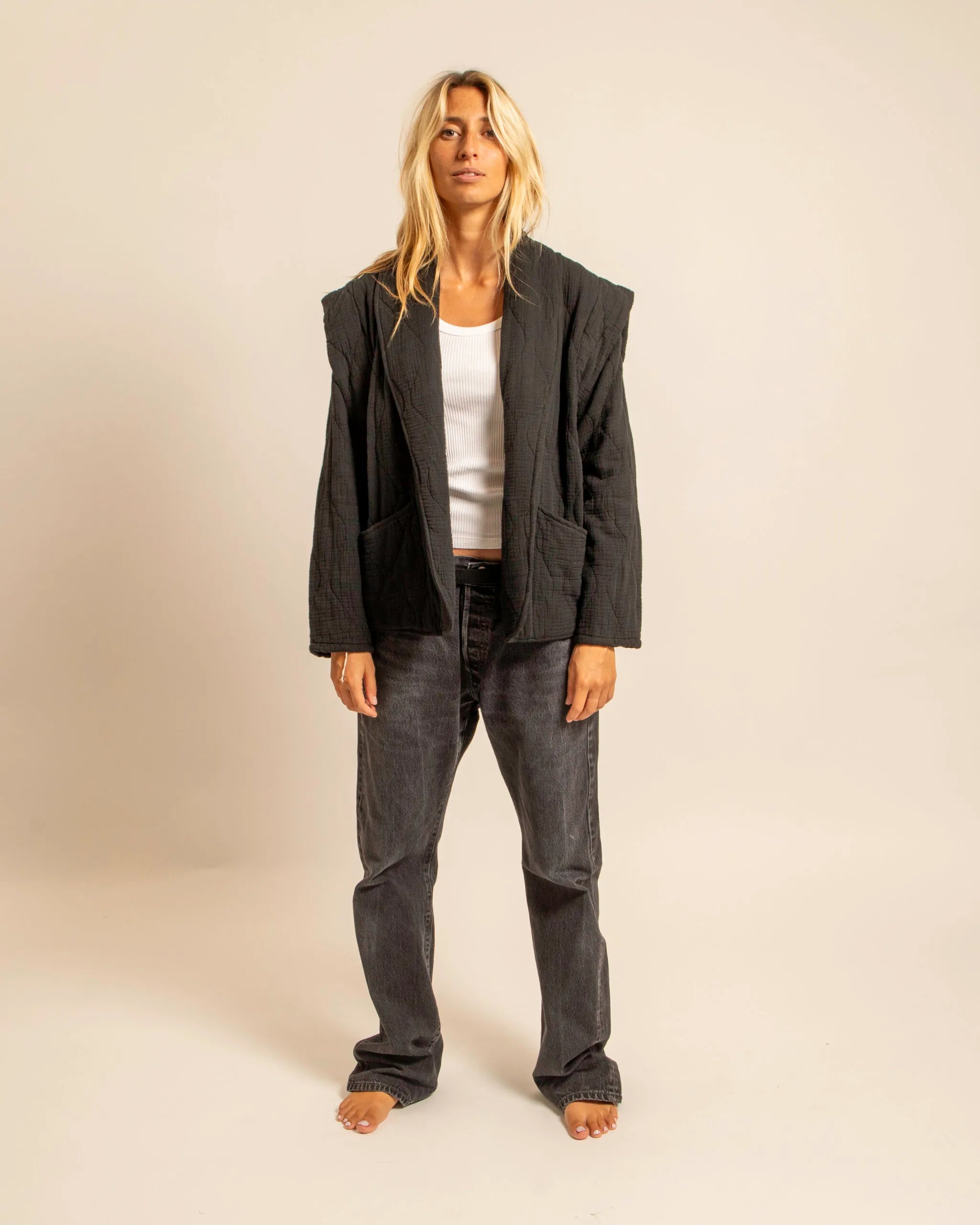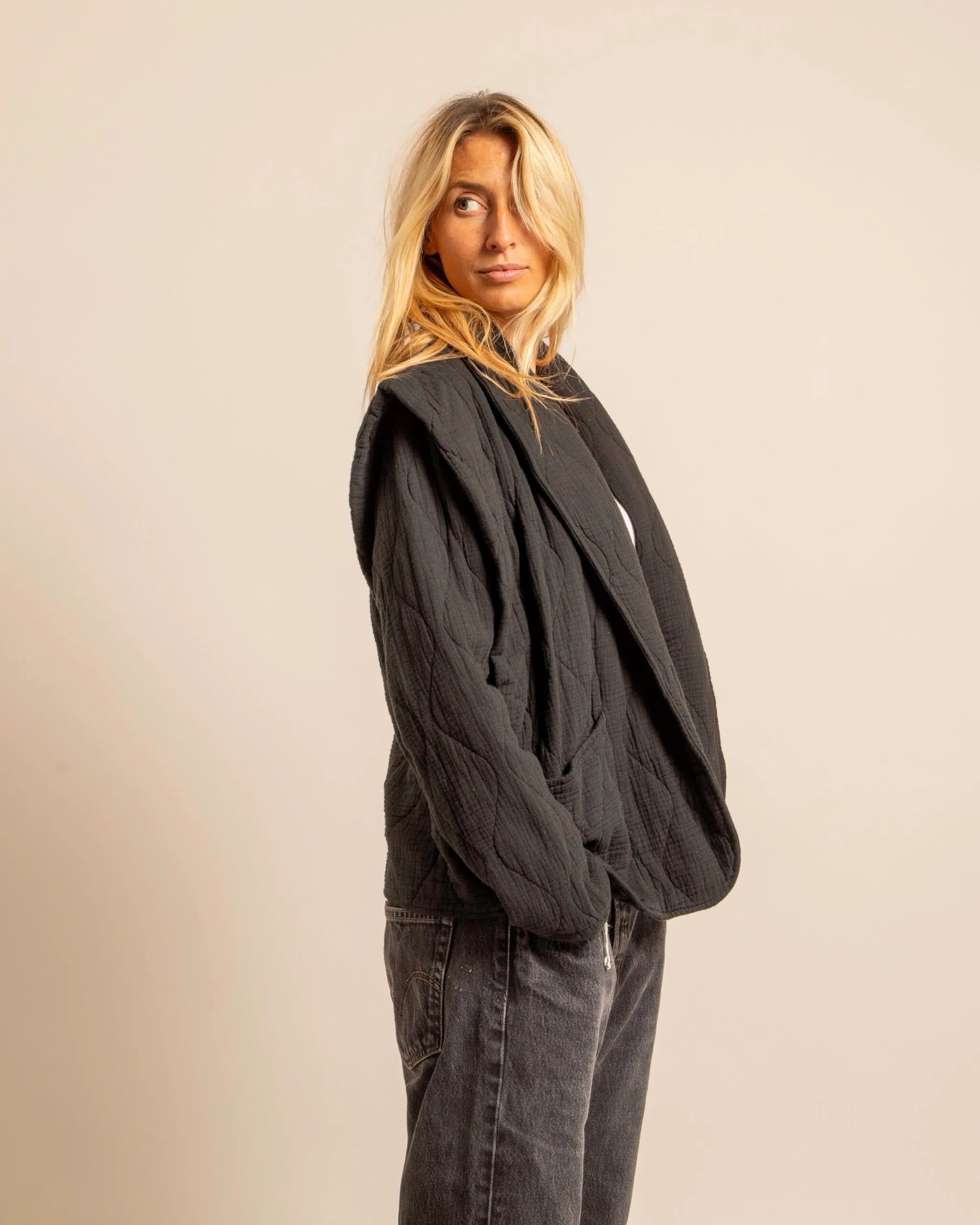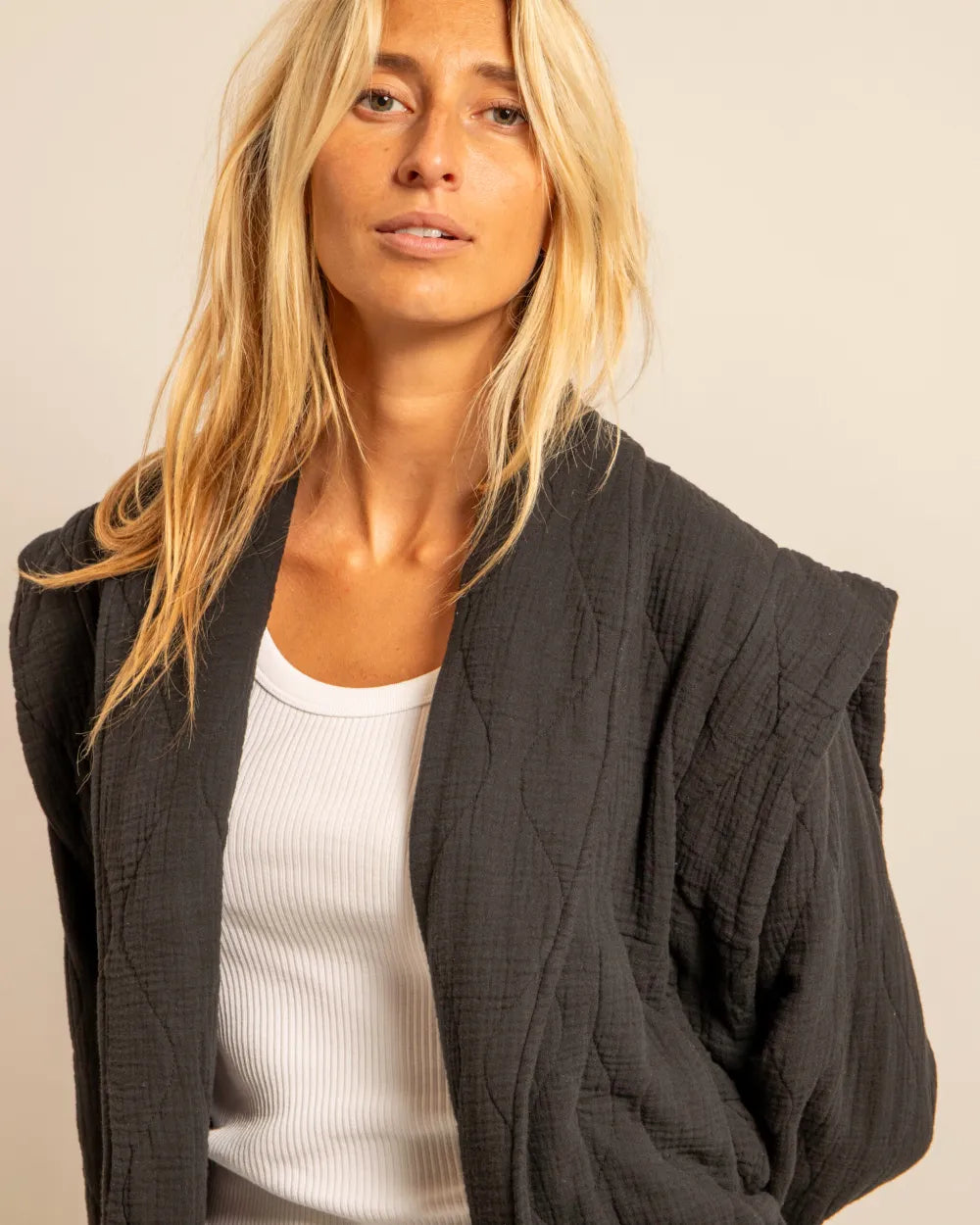 Perfect for a fashionable look, this jacket offers an effortlessly comfortable fit with a soft, cheesecloth cotton feel. Complete with an open finish, large patch pockets, and a stylish quilted design, this jacket features a pointed shoulder, inspired by the kimono.
