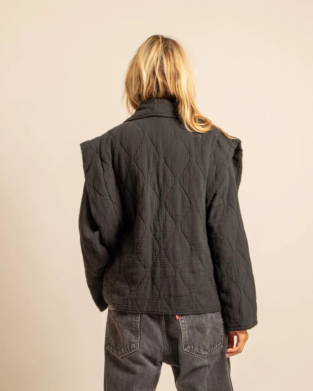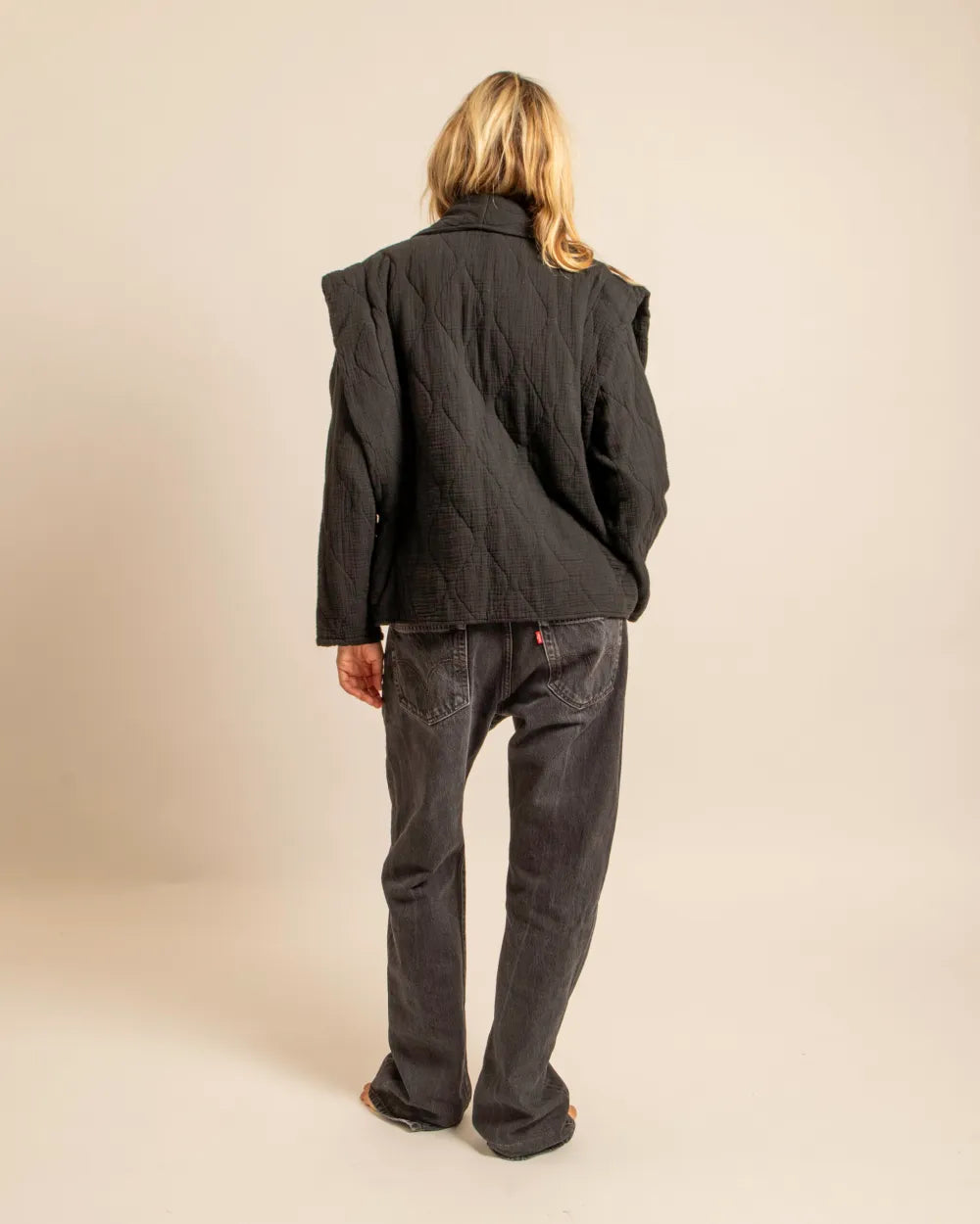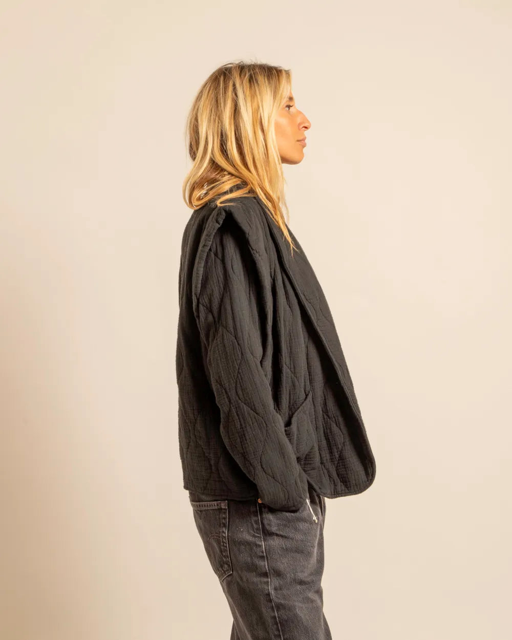 Perfect for a fashionable look, this jacket offers an effortlessly comfortable fit with a soft, cheesecloth cotton feel. Complete with an open finish, large patch pockets, and a stylish quilted design, this jacket features a pointed shoulder, inspired by the kimono.