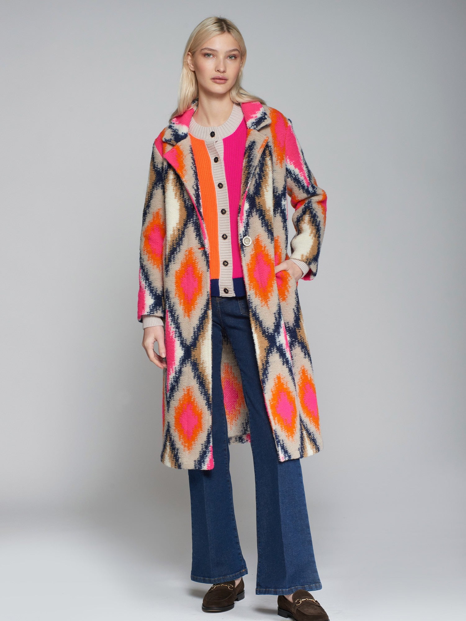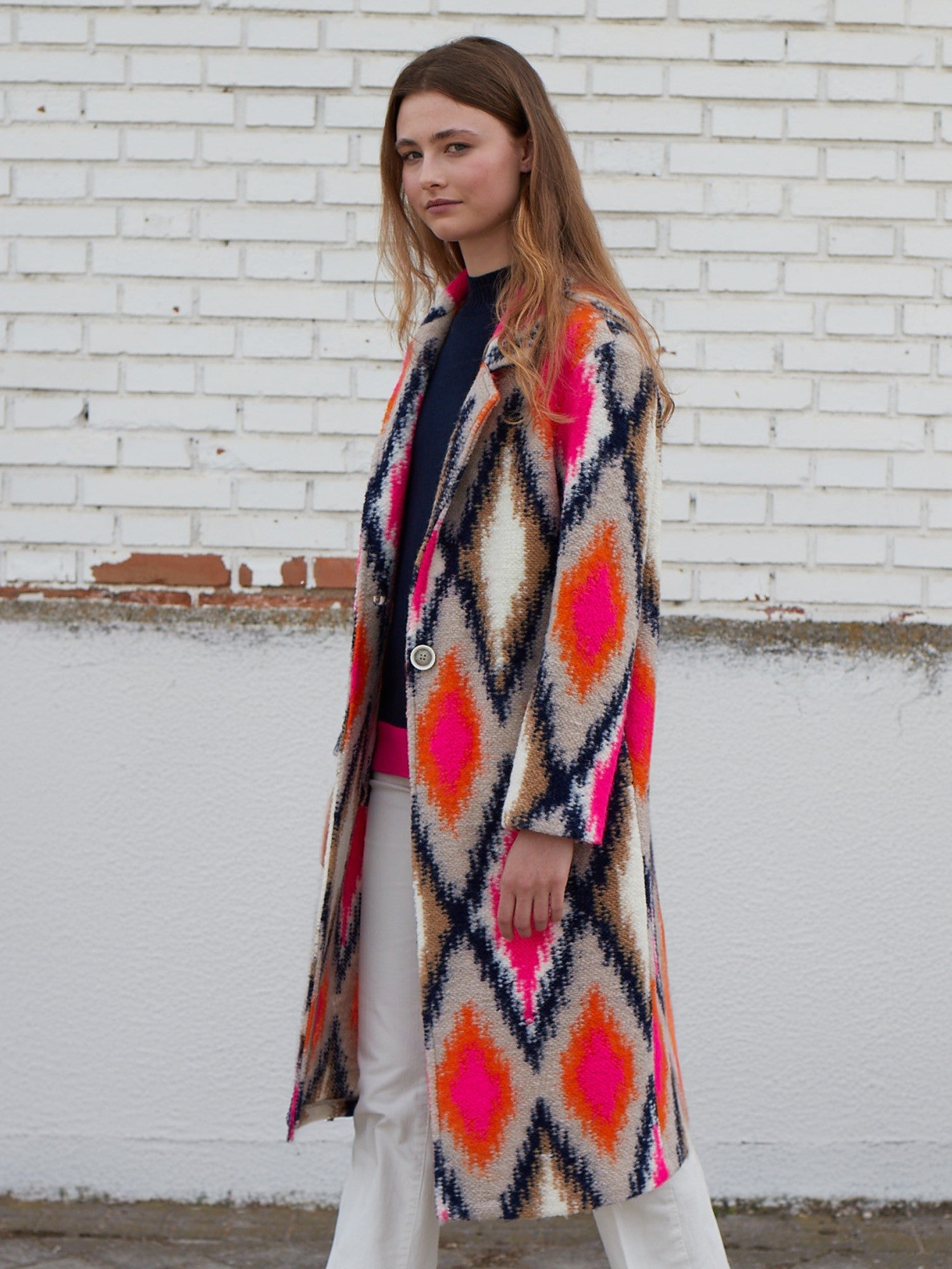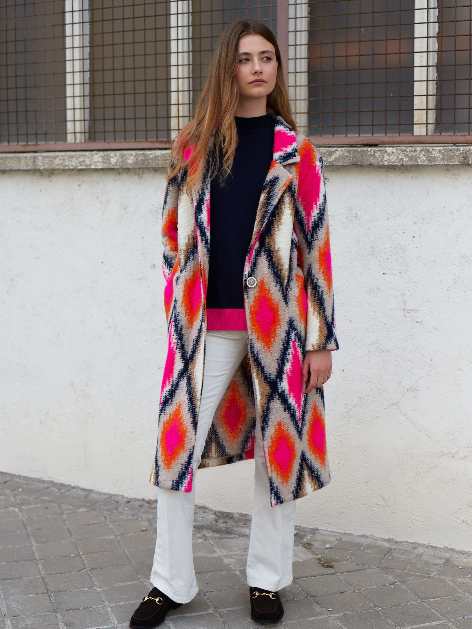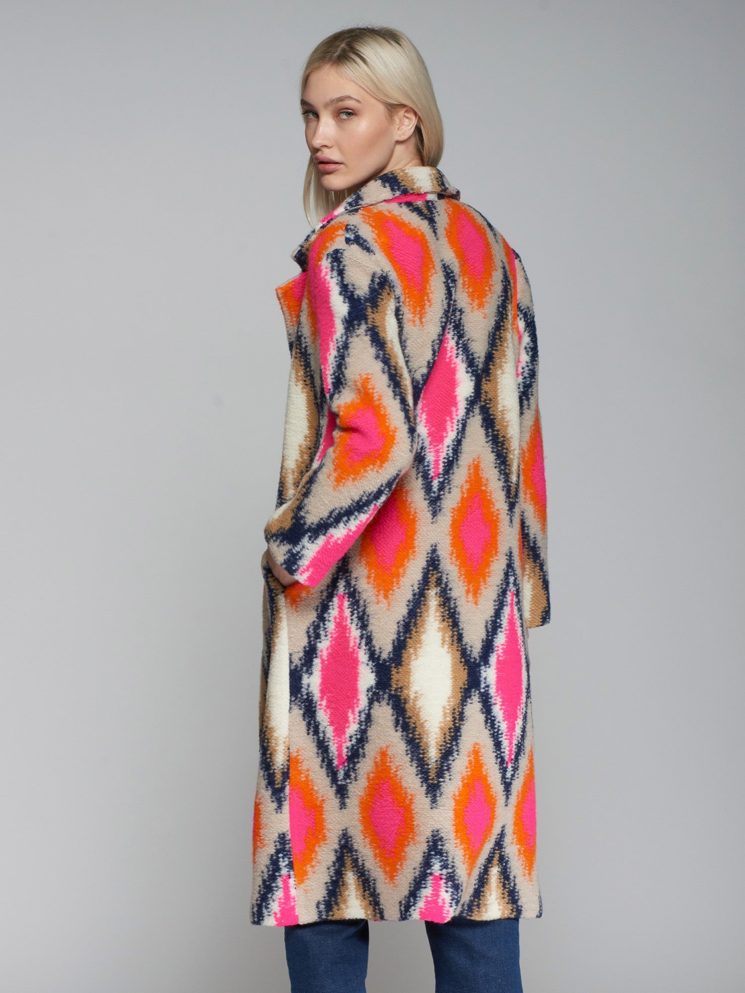 This long coat features a luxurious wool feel and a statement print that will make any outfit stand out. Stay warm and stylish with this must-have addition to your wardrobe.