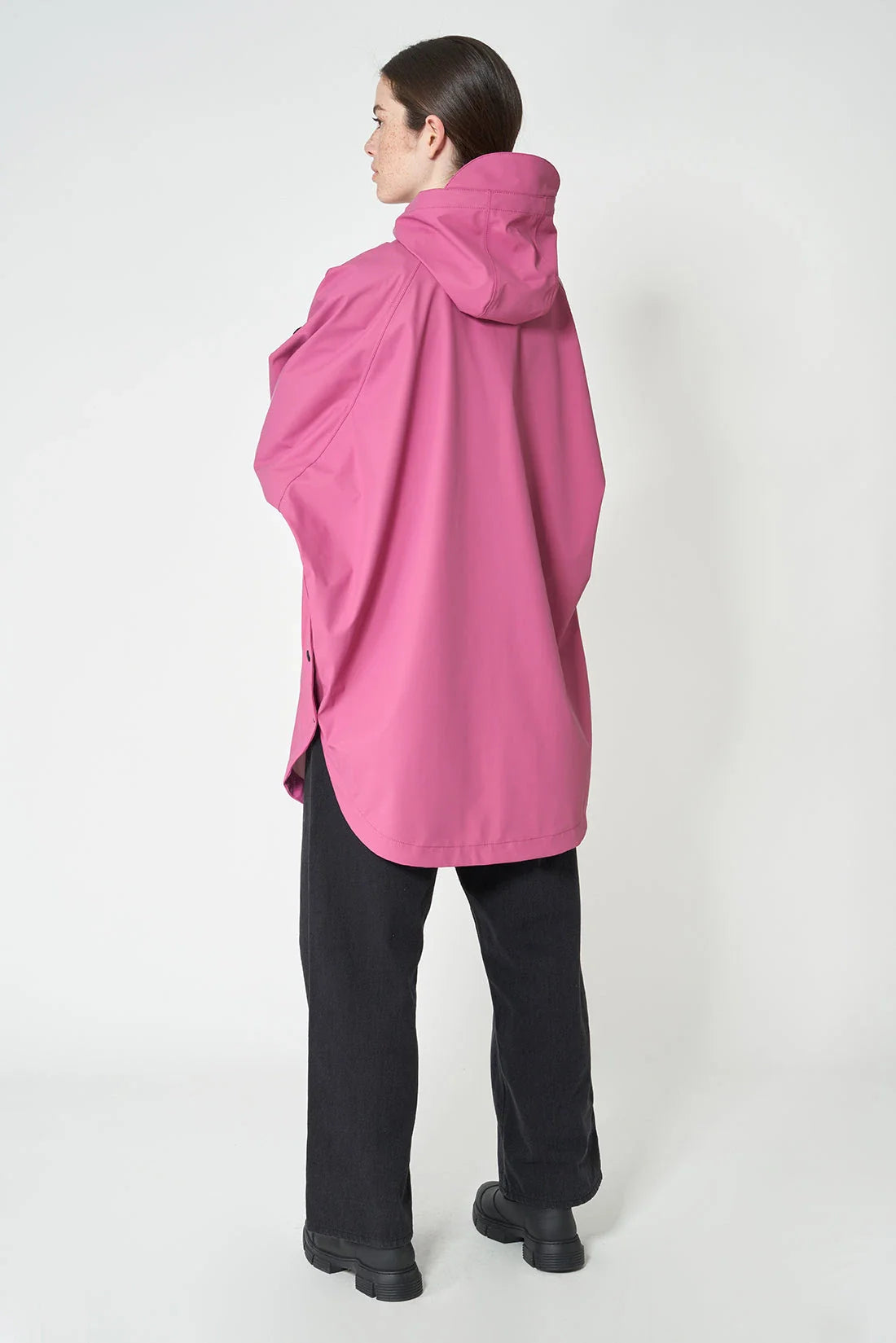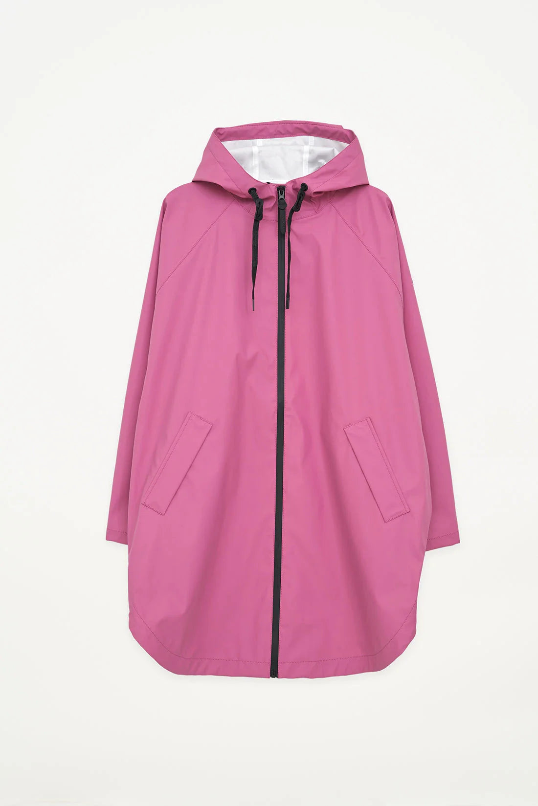 - Drawstring hood with a built-in cap and high collar