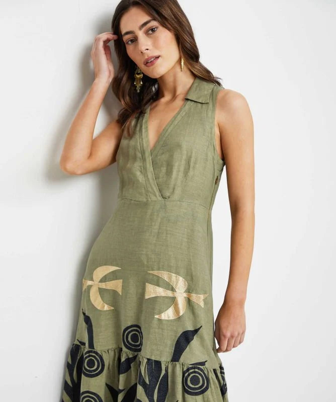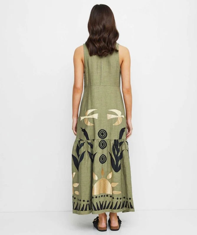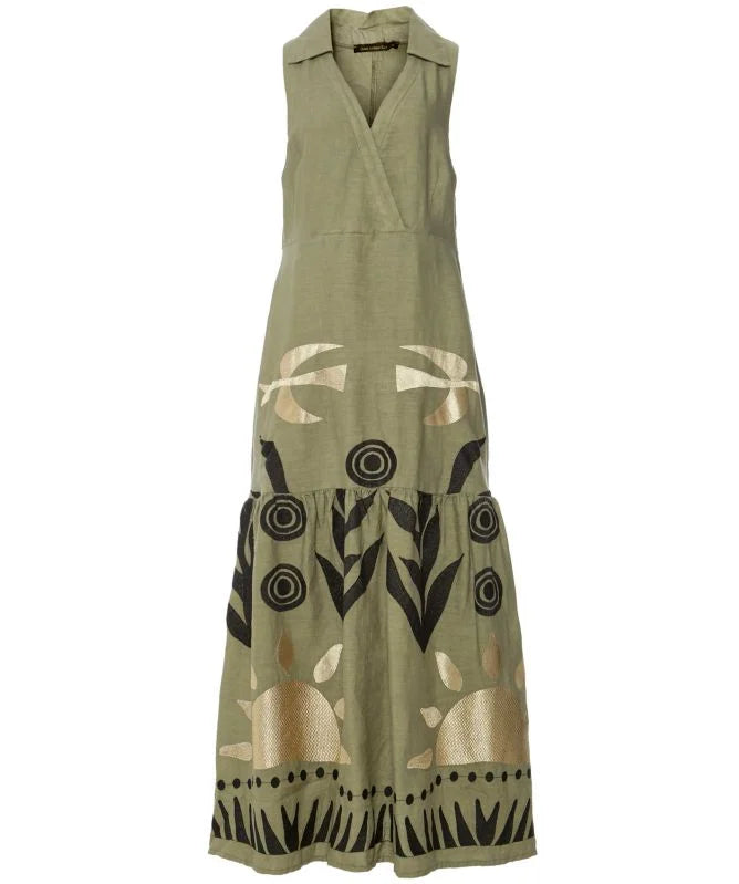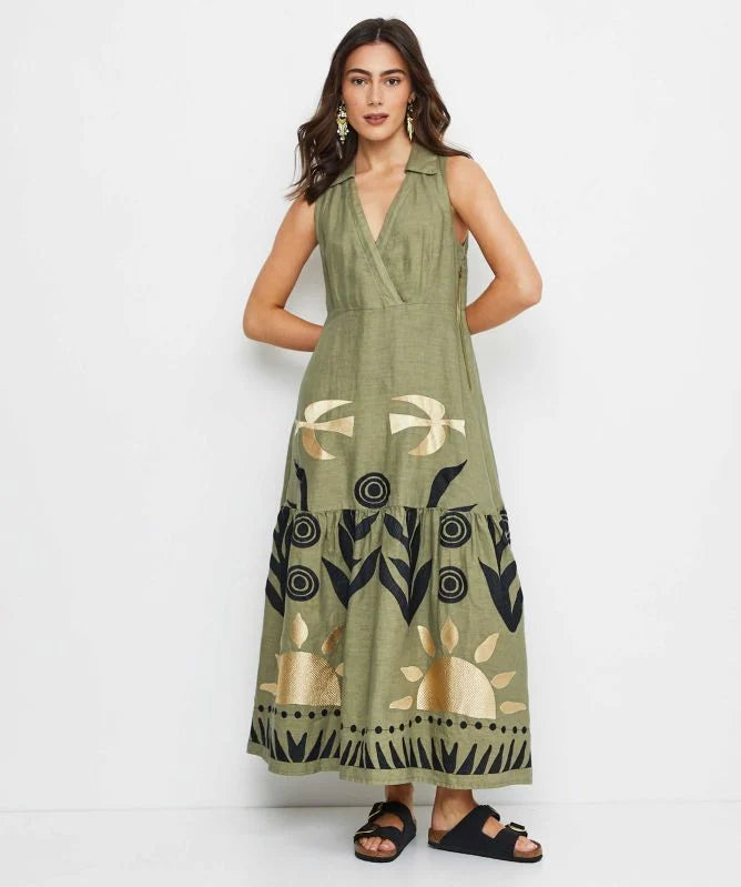 This casual maxi dress is the perfect choice for a hot summer day. The collared V-neckline is relaxed for a feminine touch and is complimented by the tiered skirt. With golden and black embroidery, this dress is sure to catch the sunshine and make a statement.