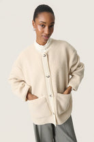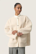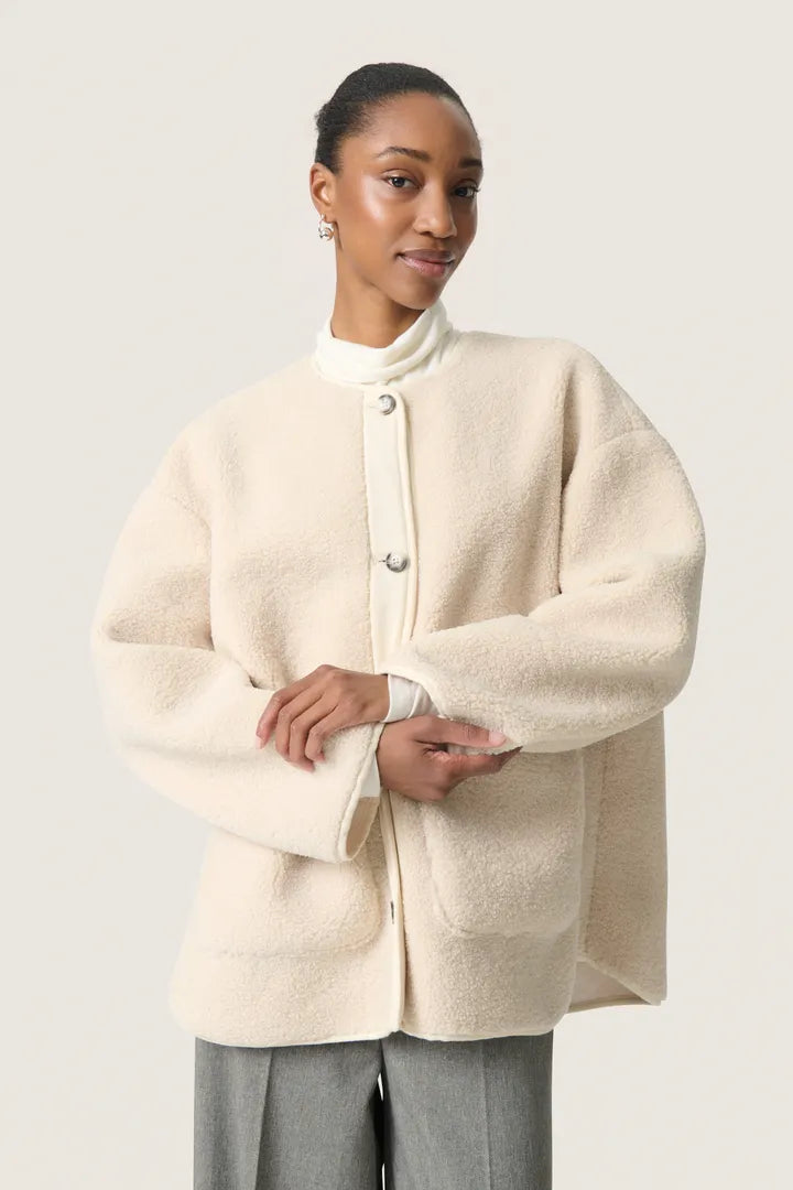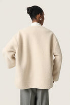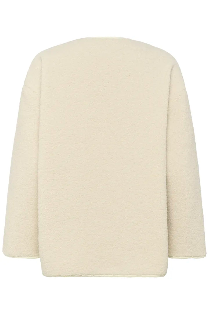 Cosy, oversized, and impossibly soft. This sherpa jacket features long, wide sleeves, a rounded neckline, and large patch pockets on the front for effortless practicality. Piped finishes add a subtle touch of polish to its relaxed, snug silhouette.