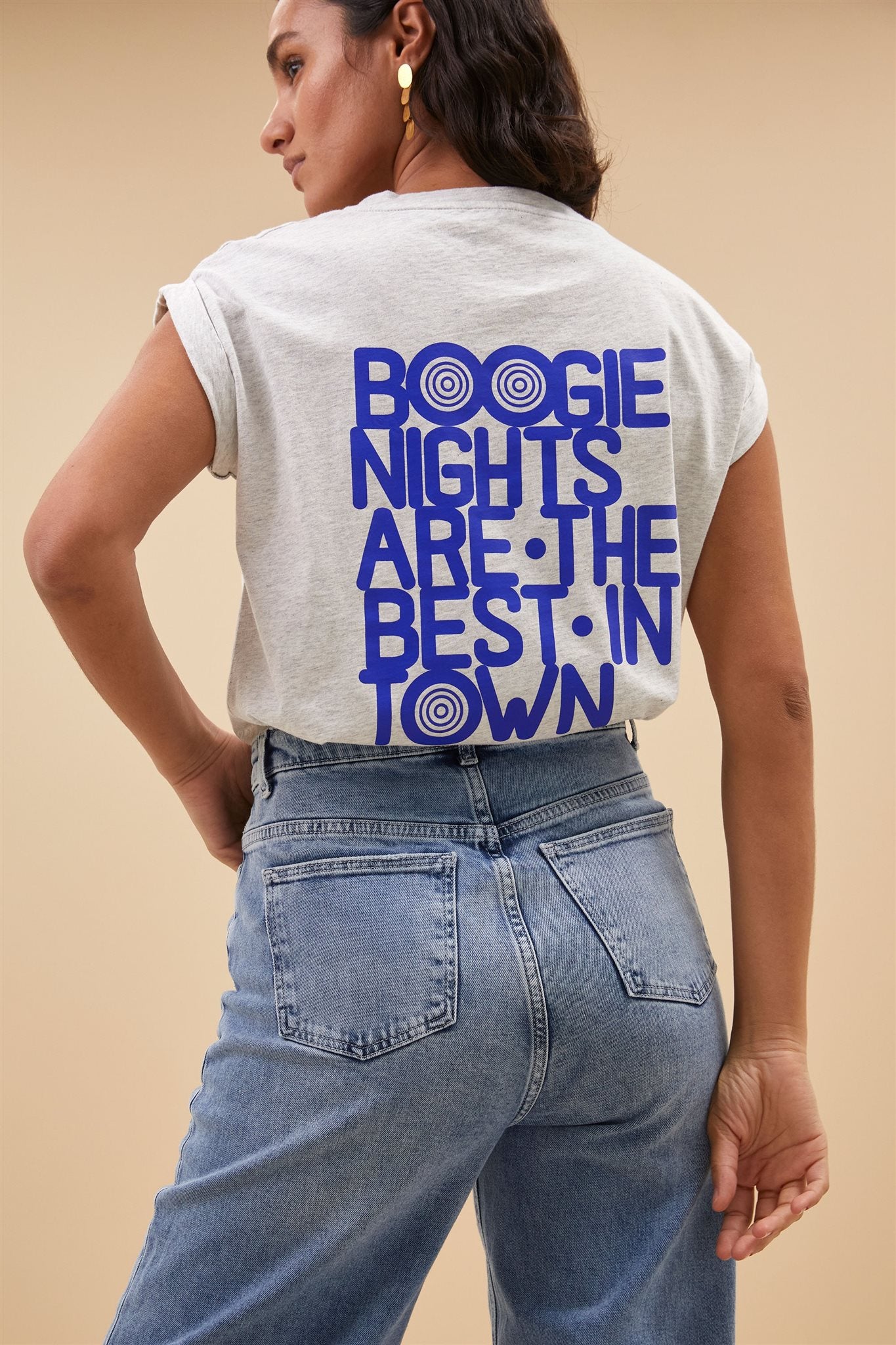 Don't let the party stop with the Thelma Boogie Nights Top from By-Bar. In a casual capped sleep style, this classic tee features a bold graphic on the back for subtle style. Pair with a wide leg jean and a depeche handbag for the ultimate timeless style.