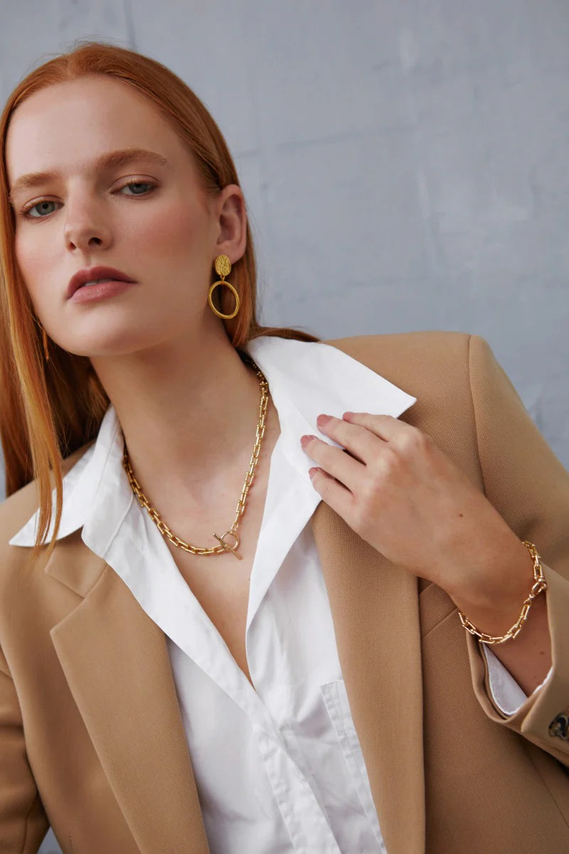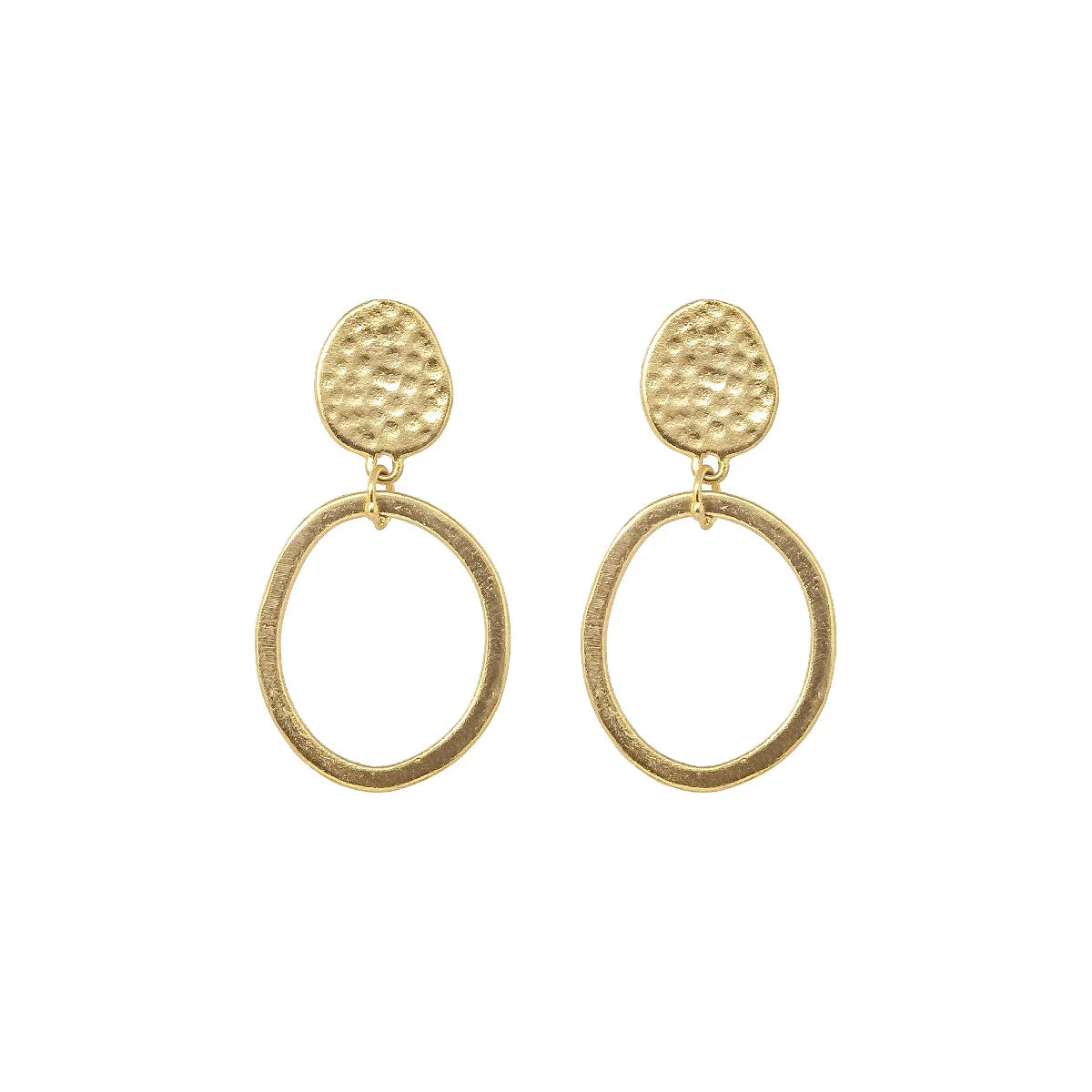 These Villar Earrings will add a touch of modern style to any outfit. The gold hoop frame, geometric design, and textured detailing make them a fashionable choice for any occasion. The abstract shape adds a unique twist to these stud earrings, making them a must-have accessory.