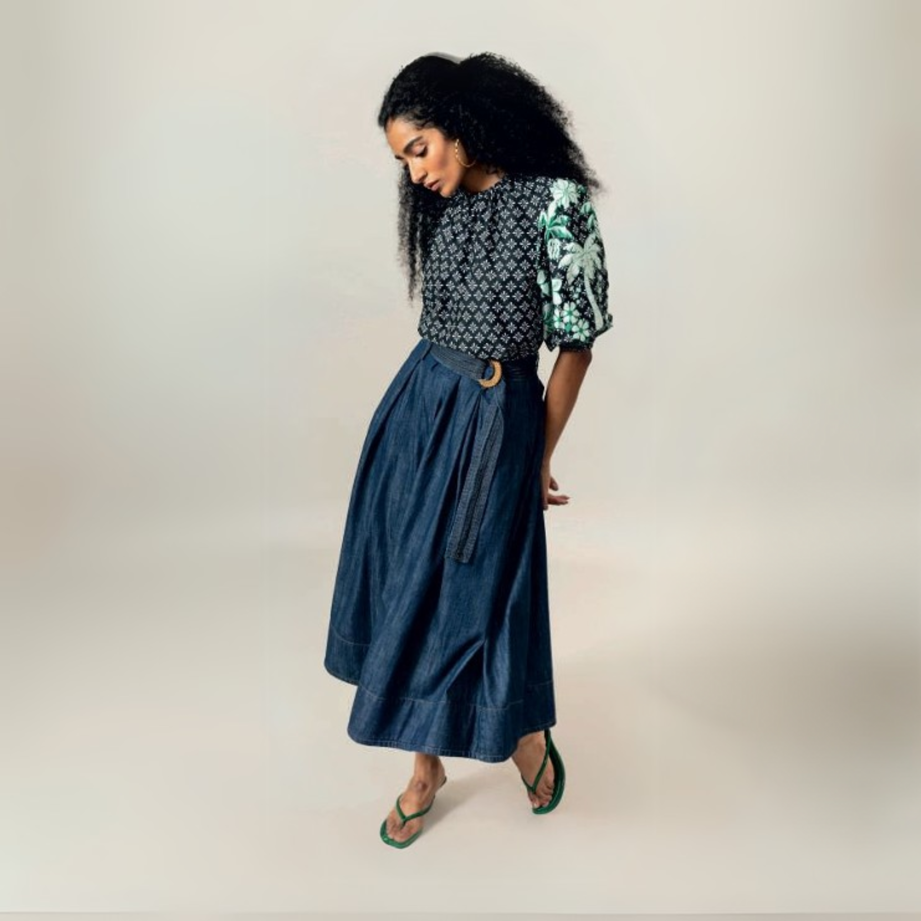 This incredibly floaty skirt is a fresh take on your usual denim piece. With a statement belt to emphasise your waist and an ankle length style for all year wear, you can pair this skirt with t-shirts, blouses and knits in the spring.