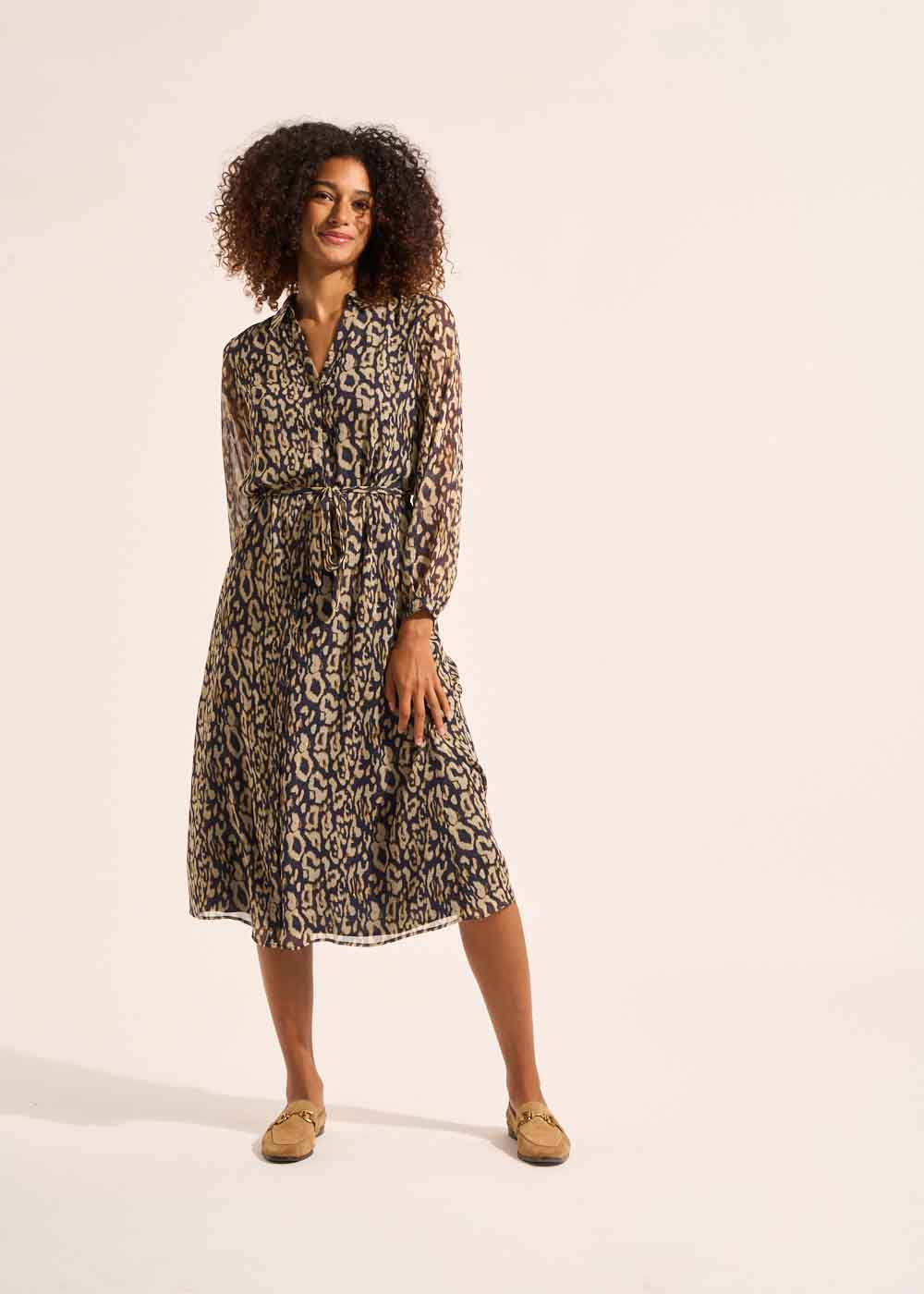Turn heads in this sparkling leopard-print midi dress, designed to bring glamour to everyday style. Crafted from lightweight voile, it features a Tunisian collar with a V-neckline, gathered details for a flattering silhouette, and long sleeves finished with buttoned cuffs and a button-front closure. The subtle sparkle in the fabric adds just the right amount of shine, making it perfect for day-to-night looks, pair with ankle boots for a casual-chic vibe or dress it up with heels for evening sparkle. Effortlessly stylish, playful, and endlessly versatile.